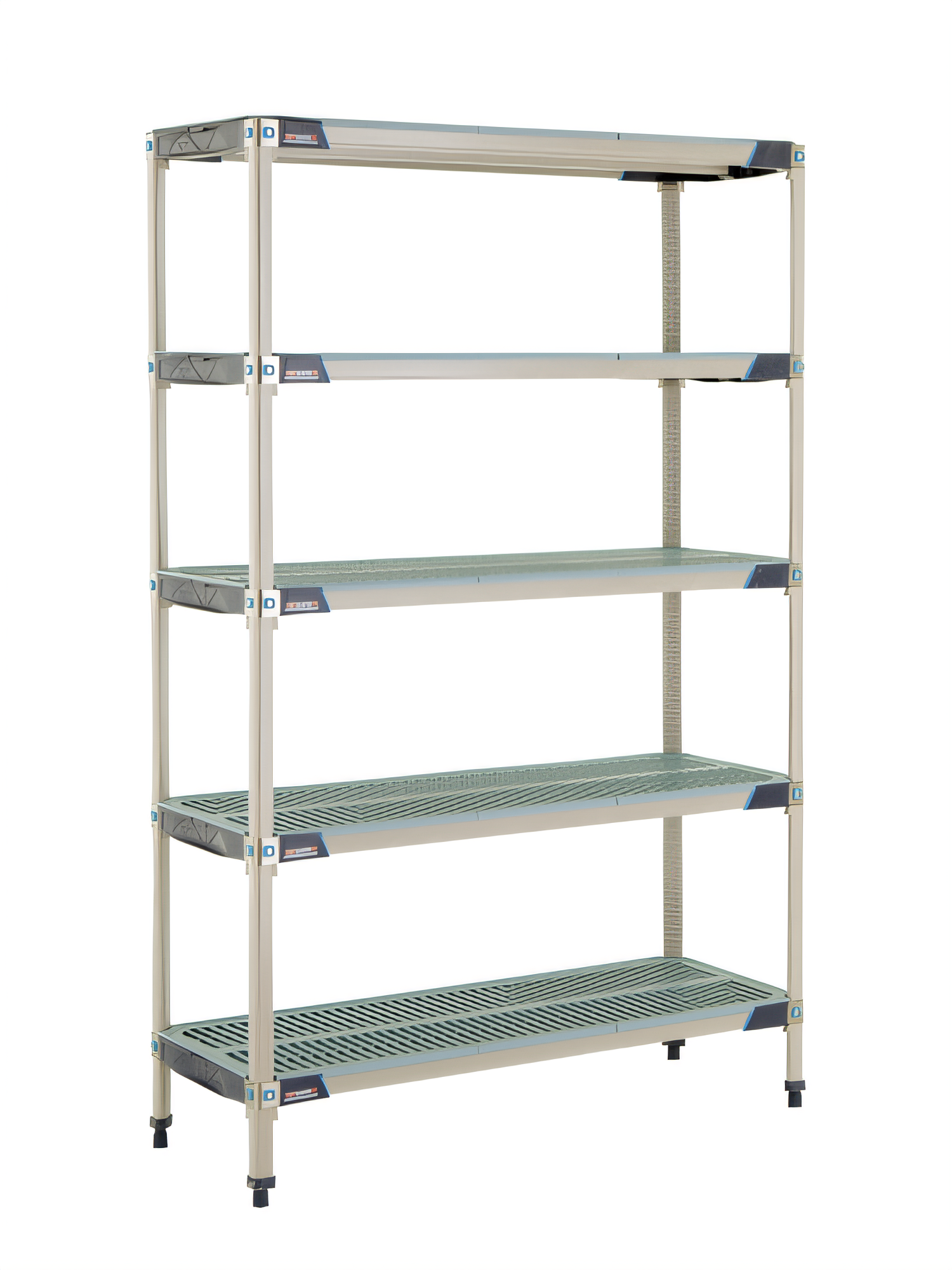 MetroMax® i Starter Shelving Unit, 48"W x 18"D x 74"H, rust proof, 1000 lb. capacity per shelf, 2000 lb. capacity per unit, (5) open grid polymer shelves with reinforced type 304 stainless steel corners and removable polymer shelf mats, bag of (4) wedge connectors included with each shelf, (4) polymer posts, Microban antimicrobial product protection, KD, NSF