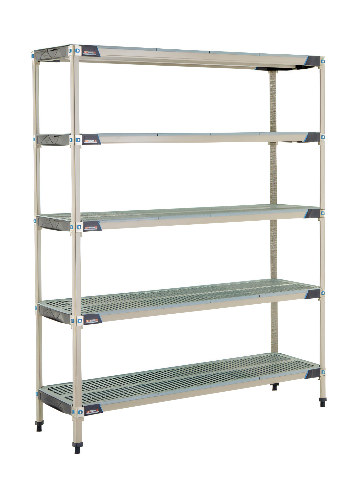 MetroMax® i Starter Shelving Unit, 60"W x 18"D x 74"H, rust proof, 750 lb. capacity per shelf, 2000 lb. capacity per unit, (5) open grid polymer shelves with reinforced type 304 stainless steel corners and removable polymer shelf mats, bag of (4) wedge connectors included with each shelf, (4) polymer posts, Microban antimicrobial product protection, KD, NSF