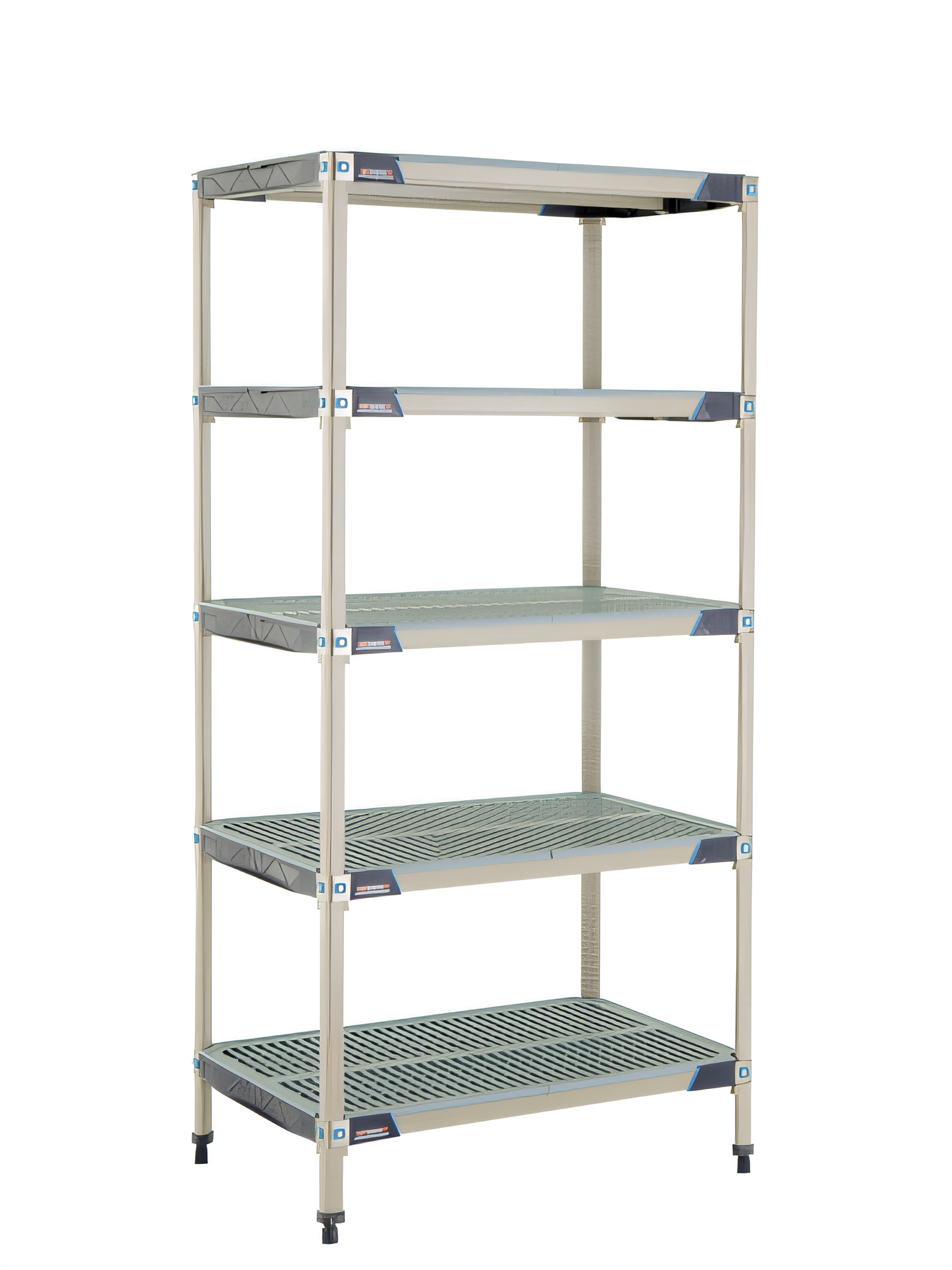 MetroMax® i Starter Shelving Unit, 36"W x 24"D x 74"H, rust proof, 1000 lb. capacity per shelf, 2000 lb. capacity per unit, (5) open grid polymer shelves with reinforced type 304 stainless steel corners and removable polymer shelf mats, bag of (4) wedge connectors included with each shelf, (4) polymer posts, Microban antimicrobial product protection, KD, NSF