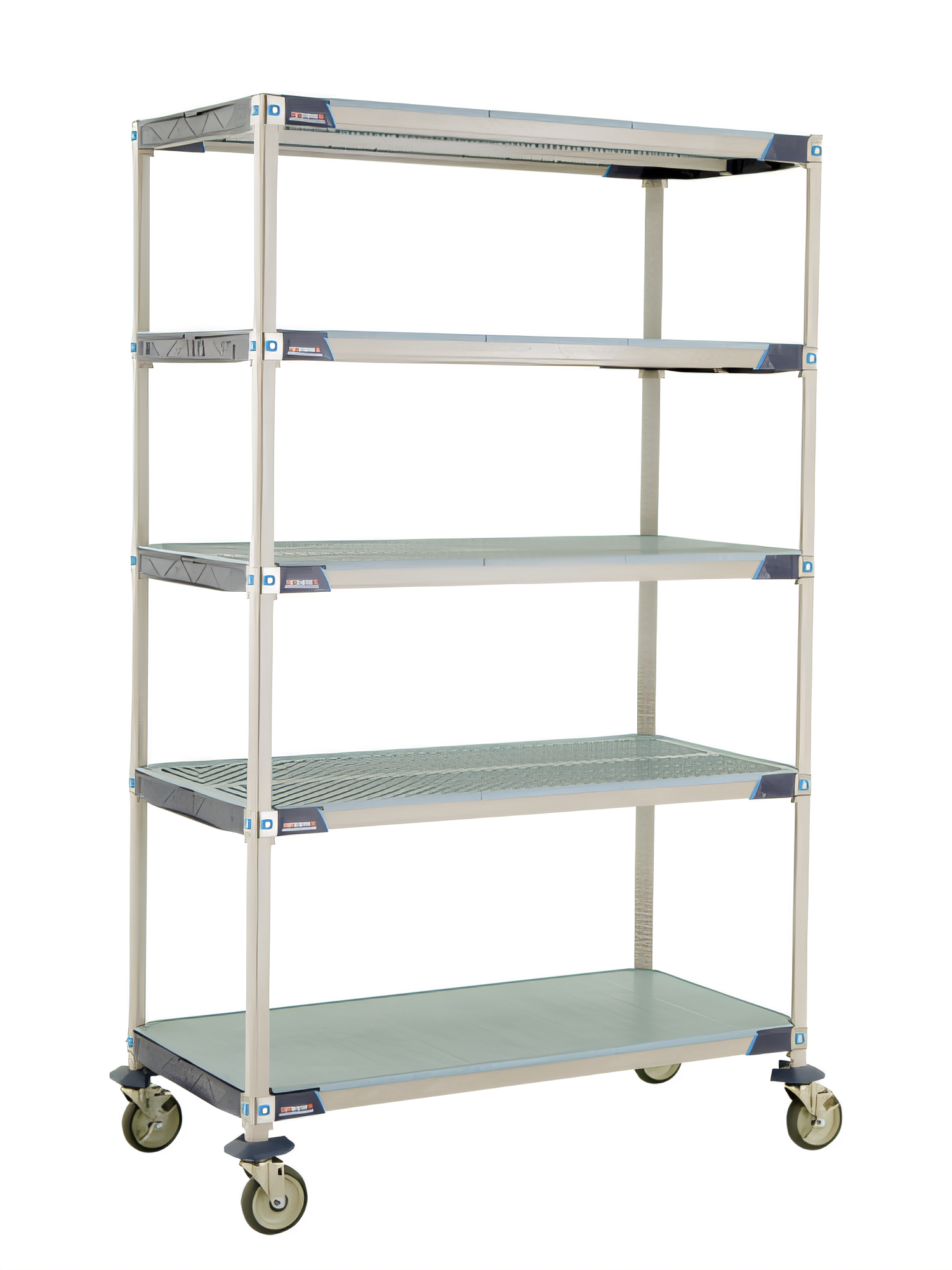 MetroMax® i Mobile Shelving Unit, 48"W x 24"D x 80"H, (4) corrosion proof open grid shelves with removable shelf mats & (1) corrosion proof solid shelf with removable shelf mat, 800 lb. capacity per shelf, (4) polymer posts (MX74UP), built in antimicrobial product protection, (4) stem casters, NSF