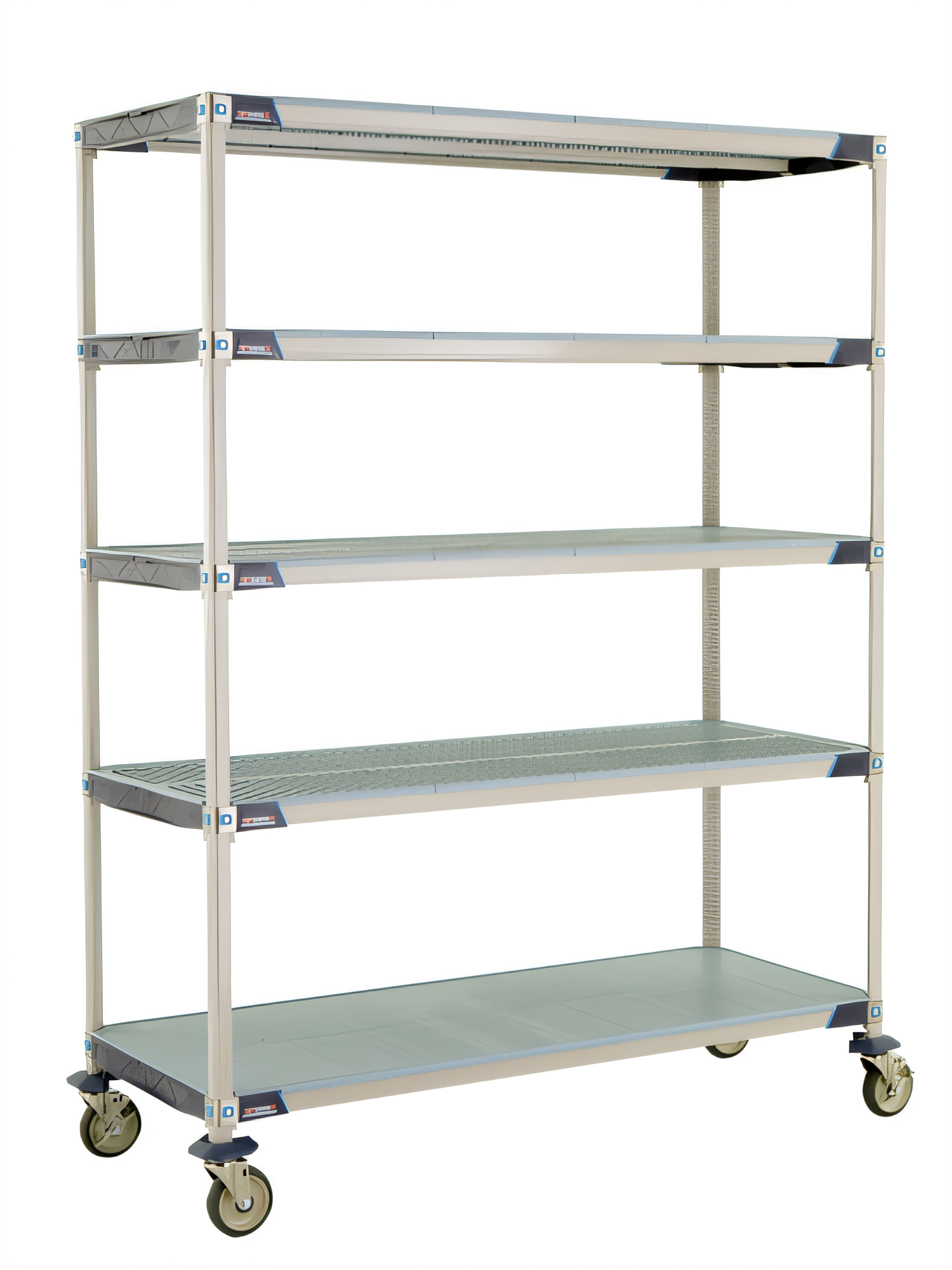 MetroMax® i Mobile Shelving Unit, 60"W x 24"D x 80"H, (4) corrosion proof open grid shelves with removable shelf mats & (1) corrosion proof solid shelf with removable shelf mat, 600 lb. capacity per shelf, (4) polymer posts (MX74UP), built in antimicrobial product protection, (4) stem casters, NSF