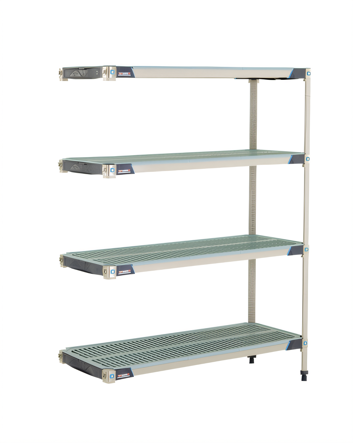 MetroMax® i Add-On Shelving Unit, 48"W x 18"D x 63"H, rust proof, 1000 lb capacity per shelf, 2000 lb. capacity per unit, includes: (4) open grid polymer shelves with reinforced type 304 stainless steel corners and removable polymer shelf mats, bag of (4) wedge connectors included with each shelf, (2) polymer posts & (8) "S"Hooks for an end-to-end configuration, Microban antimicrobial product protection, KD, NSF