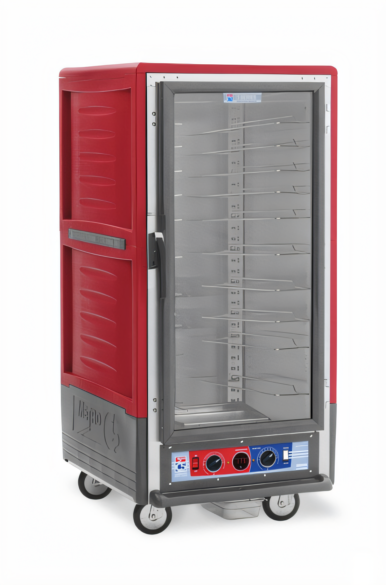 C5™ 3 Series Heated Holding & Proofing Cabinet, lower wattage, with Red Insulation Armour™, mobile, 3/4 height, insulated, clear polycarbonate door, removable bottom mount control module, thermostat to 200°F, universal wire slides on 3" centers, adjustable on 1-1/2" increments (14) 18" x 26" or (26) 12" x 20" x 2-1/2" pan capacity, 5" casters (2 with brakes), aluminum, 120v/60/1-ph, 1440 watts, 12 amps, NEMA 5-15P, cULus, NSF