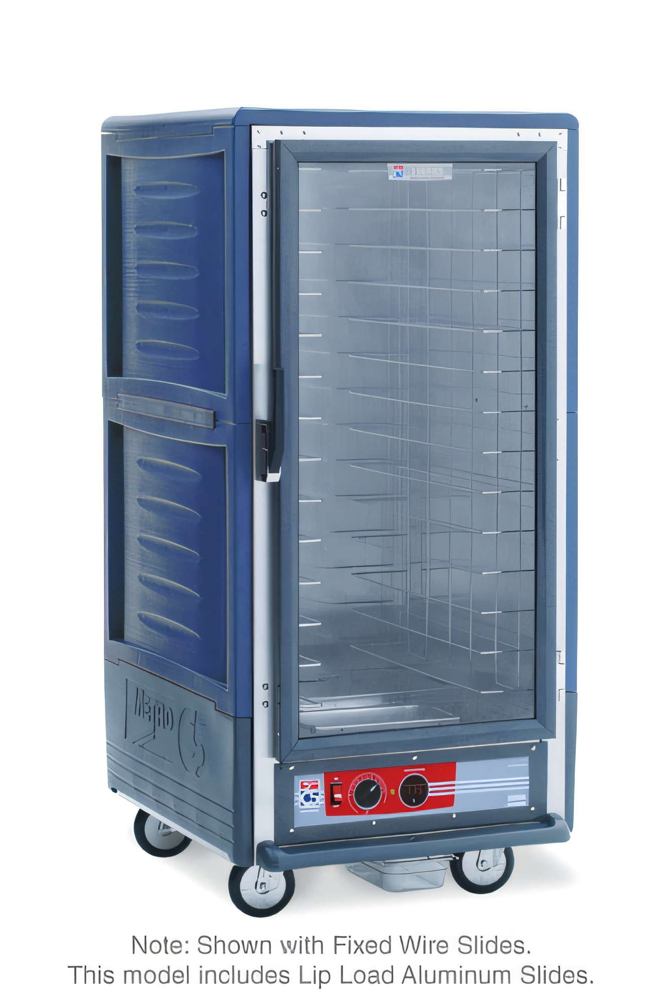 C5™ 3 Series Heated Holding Cabinet, with Blue Insulation Armour™, mobile, 3/4 height, insulated, clear polycarbonate door, removable bottom mount control module, thermostat to 200°F, lip load slides on 1 1/2" centers (27) 18" x 26" pan capacity, 5" casters (2 with brakes), aluminum, 120v/60/1 ph, 2000 watts, 16.7 amps, NEMA 5 20P, cULus, NSF