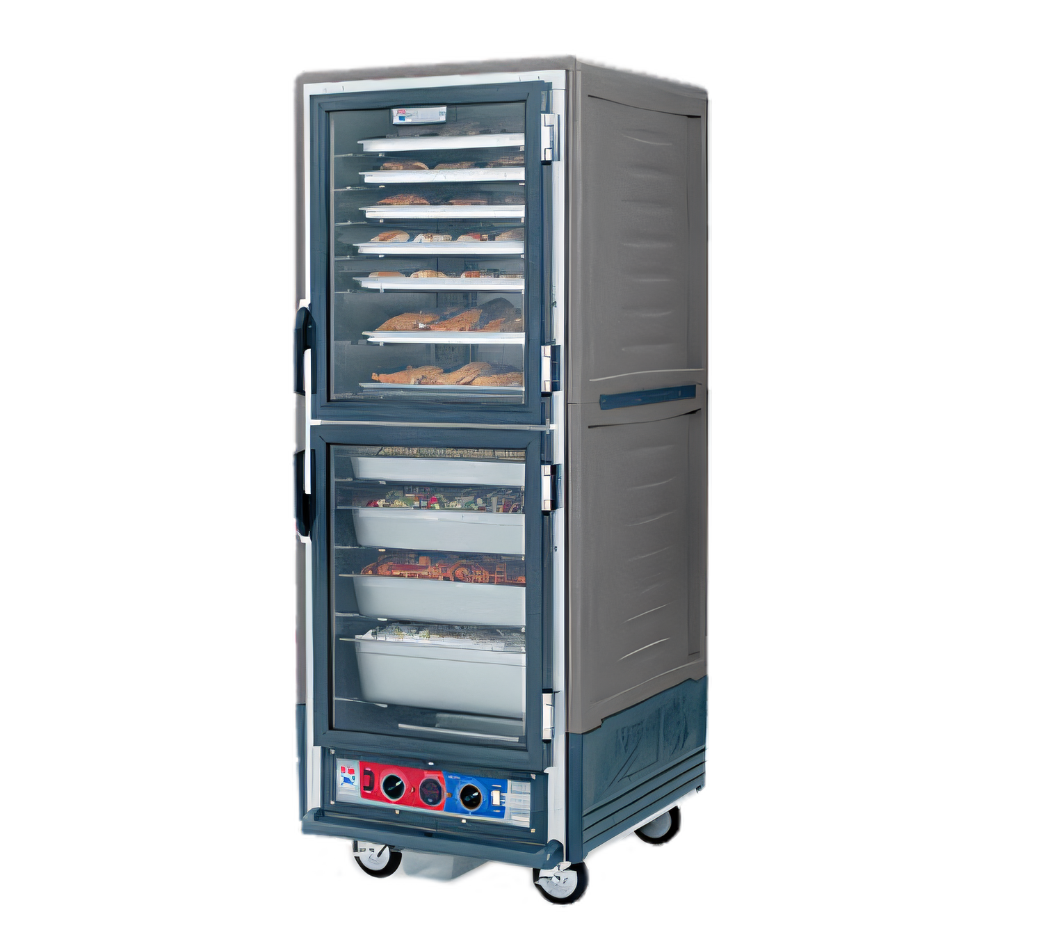 C5™ 3 Series Heated Holding Cabinet, lower wattage, with Grey Insulation Armour™, mobile, full height, insulated, Dutch clear polycarbonate doors, removable bottom mount control module, thermostat to 200°F, universal wire slides on 3" centers, adjustable on 1 1/2" increments (18) 18" x 26" or (34) 12" x 20" x 2 1/2" pan capacity, 5" casters (2 with brakes), aluminum, 120v/60/1 ph, 1440 watts, 12 amps, NEMA 5 15P, UL, CUL, NSF