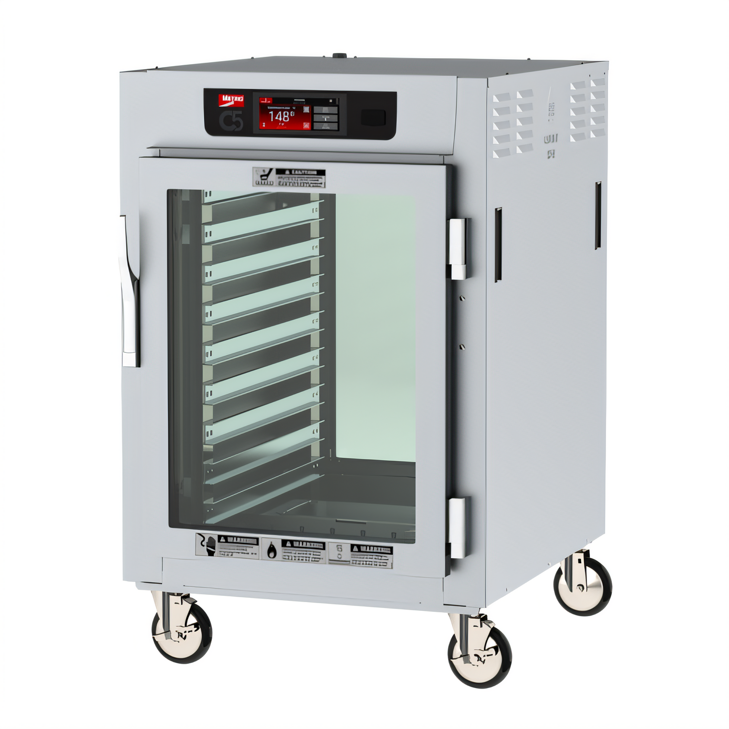 C5™ 8 Series Controlled Temperature Holding Cabinet with 6.8" touch-screen controls, mobile, 1/2 height, pass thru, insulated, double pane tempered glass doors, lip load, (8) 18" x 26" pan capacity, 3" O.C., 5" casters, 304 stainless steel, 120v/60/1-ph, 2000 watts, 16.7 amps, NEMA 5-20P, cULus, NSF, Made in USA