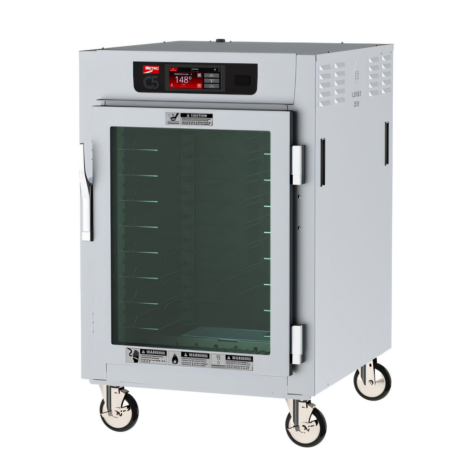 C5™ 8 Series Controlled Temperature Holding Cabinet with 6.8" touch-screen controls, mobile, 1/2 height, insulated, tempered double pane glass doors, universal wire slides, (8) 18" x 26" or (16) 12" x 20" x 2-1/2" pan capacity, 3" O.C. (adjustable on 1-1/2" increments), 5" casters, 304 stainless steel, 120v/60/1-ph, 2000 watts, 16.7 amps, NEMA 5-20P, cULus, NSF, Made in USA