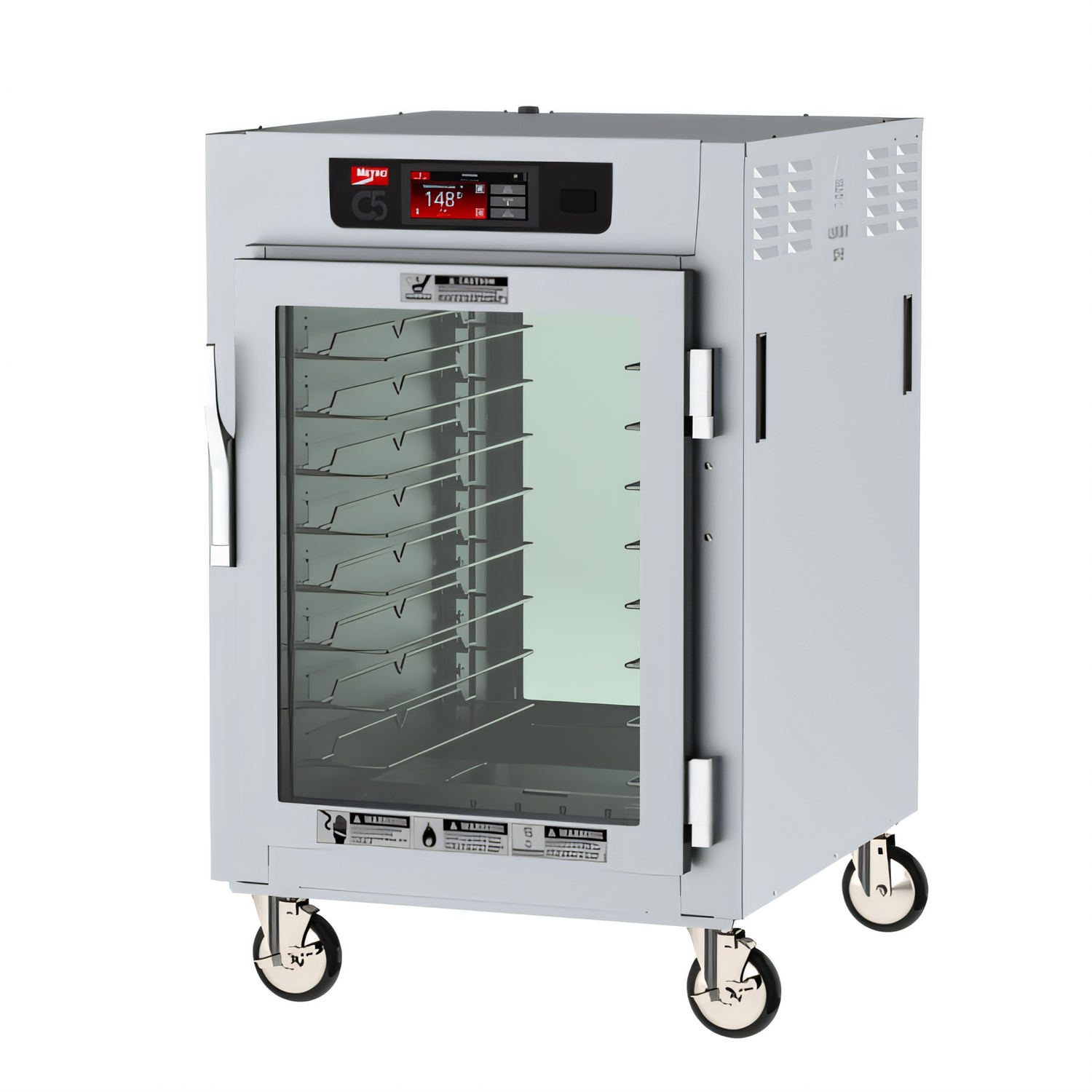 C5™ 8 Series Controlled Temperature Holding Cabinet with 6.8" touch-screen controls, mobile, 1/2 height, pass thru, insulated, tempered double pane glass doors, universal wire slides, (8) 18" x 26" or (16) 12" x 20" x 2-1/2" pan capacity, 3" O.C. (adjustable on 1-1/2" increments), 5" casters, 304 stainless steel, 120v/60/1-ph, 2000 watts, 16.7 amps, NEMA 5-20P, cULus, NSF, Made in USA