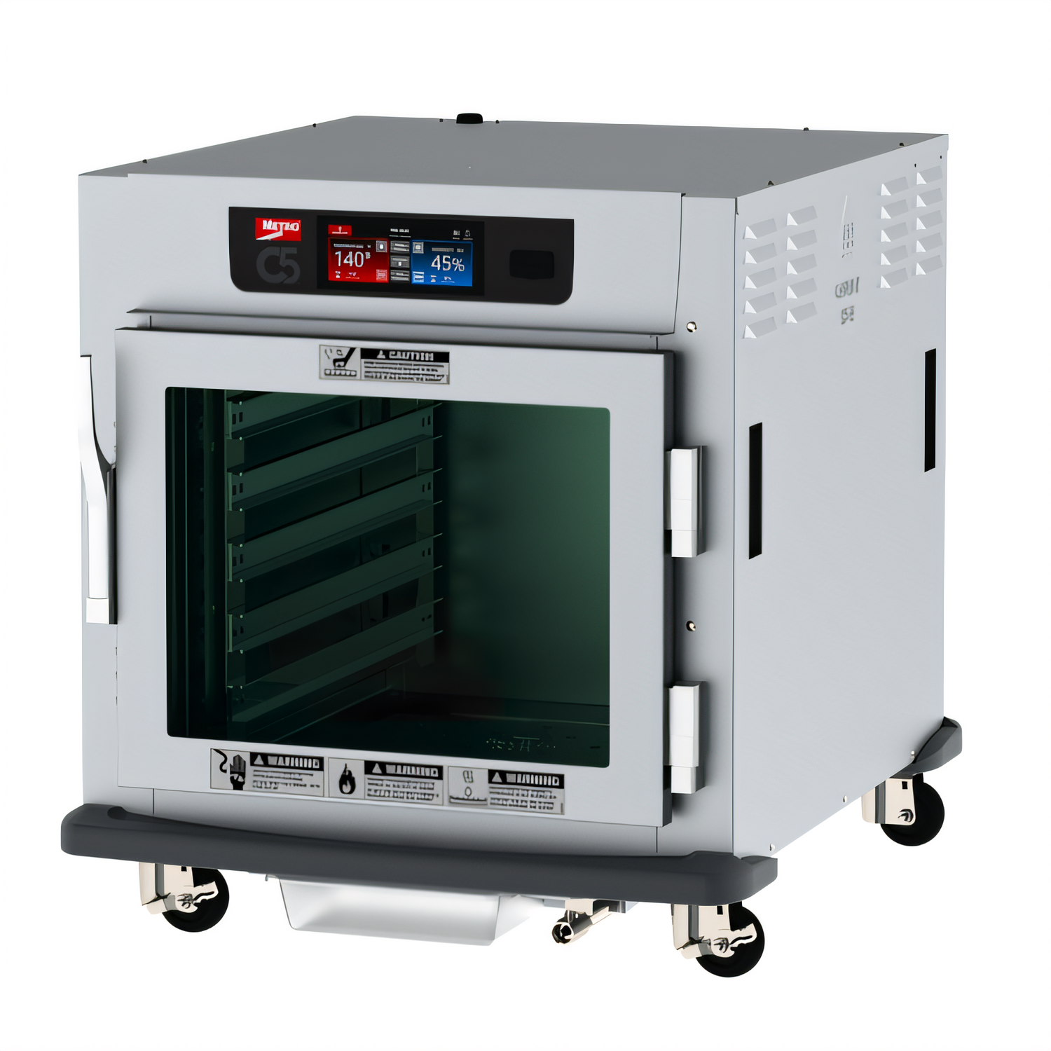 C5™ 9 Series Controlled Humidity Heated Holding and Proofing Cabinet with 6.8" touch-screen controls, mobile, undercounter, clear double panel tempered glass door, lip load slides, capacity (10) 18" x 26" pans, 1-1/2" O.C., stainless steel, 3" casters, polymer bumper & drip trough combination, 120v/60/1-ph, 1440 watts, 12 amps, NEMA 5-15P, cULus, NSF, Made in USA
