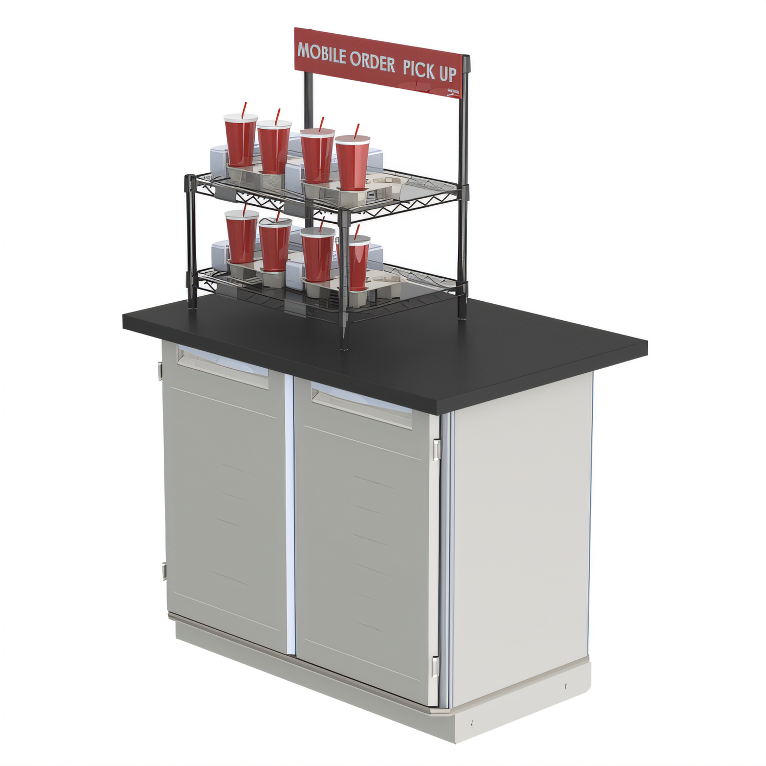 Countertop To-Go Order Pick-Up Station with Sign, (2) 18"W x 24"D shelves, clear plastic mat shelf inlays, standard label holders, black epoxy coated steel construction, ships in one box