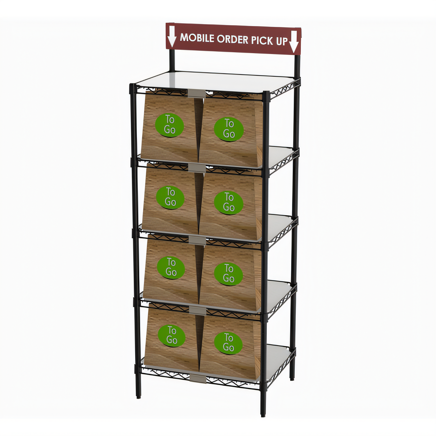 To-Go Order Pick-Up Station with Sign, (5) 24"W x 18"D shelves, flat hardboard mat shelf inlays, standard label holders, black epoxy coated steel construction, ships in one box