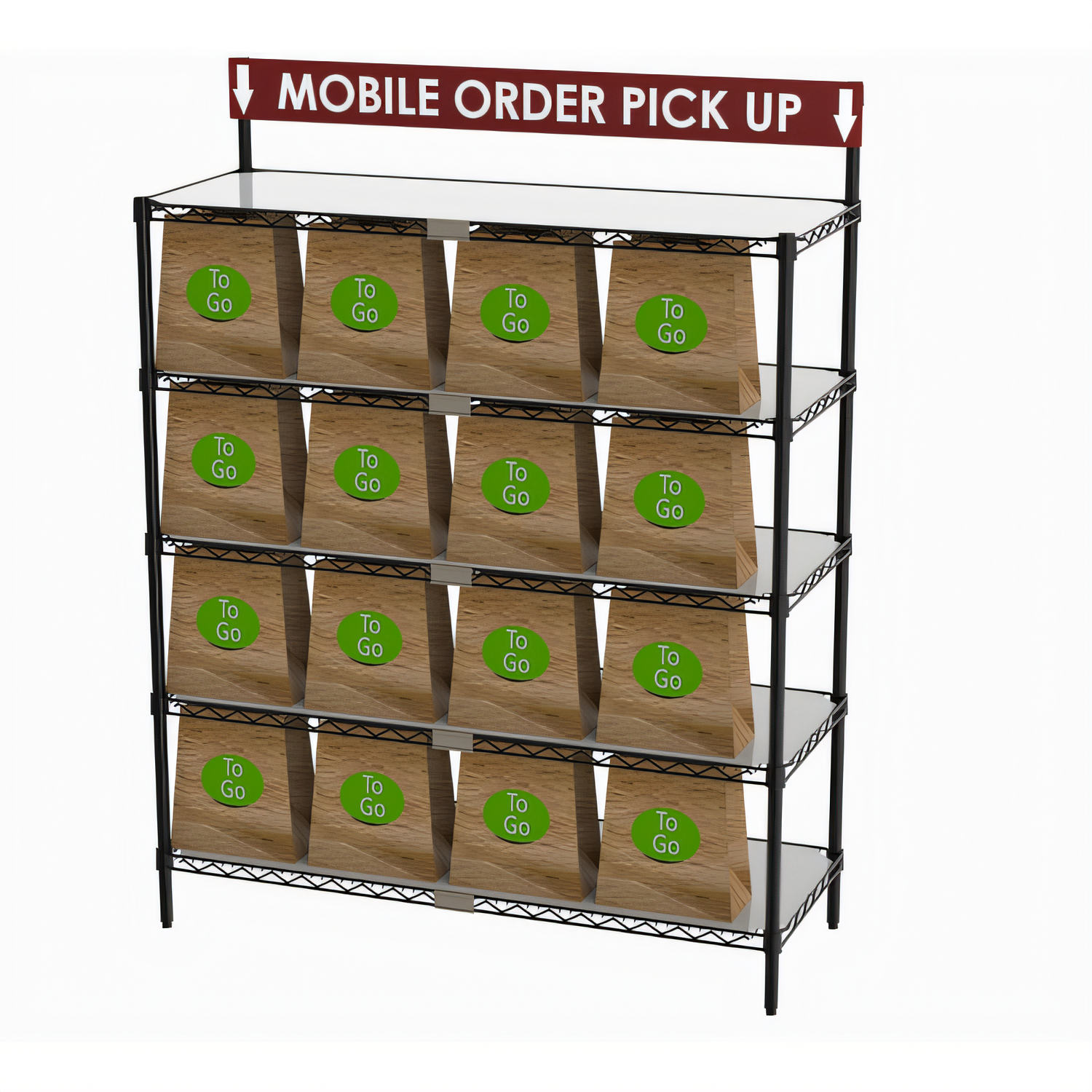 To-Go Order Pick-Up Station with Sign, 48"W x 18"D shelves, flat hardboard mat shelf inlays, standard label holders, black epoxy coated steel construction, ships in one box
