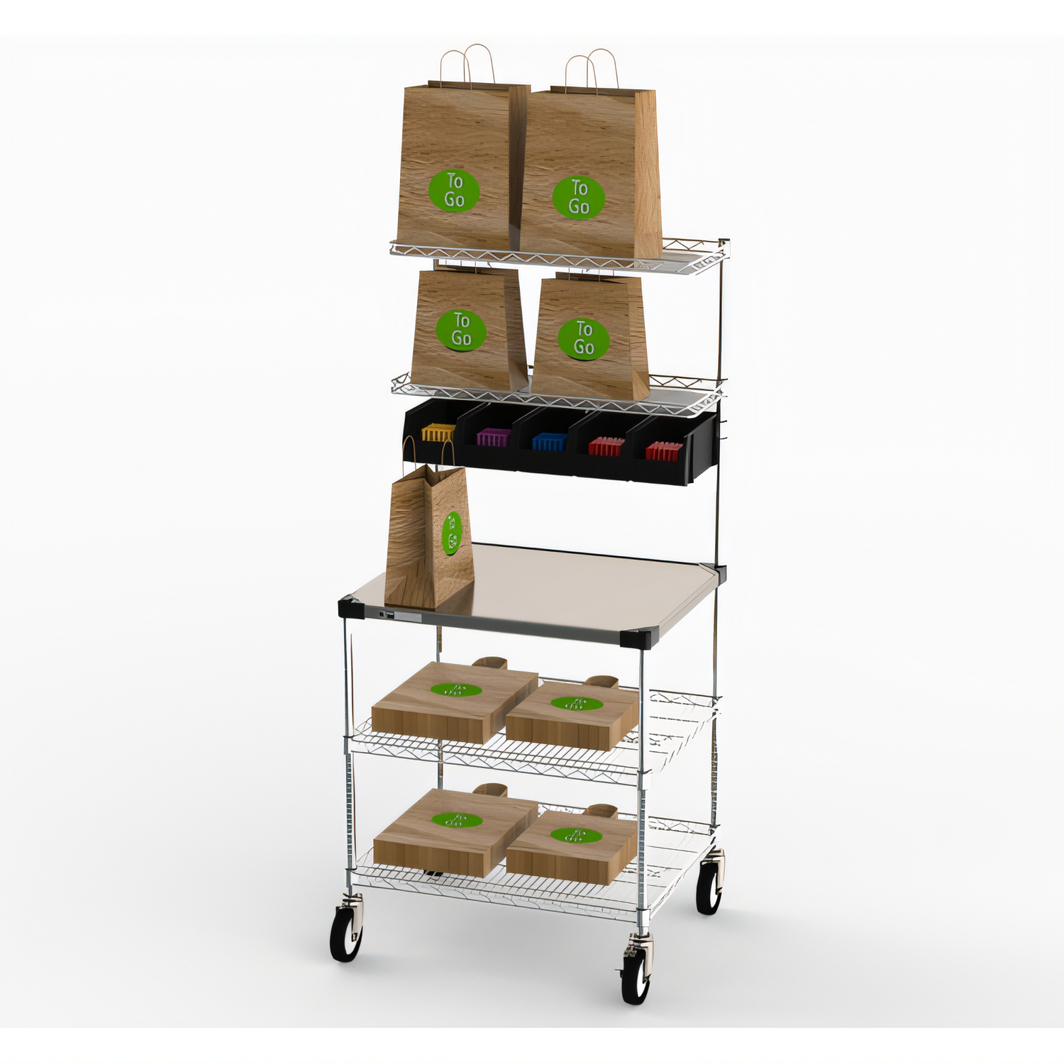 Delivery Staging / Drive-Thru Station, mobile, small, 5-tier, 30"W x 24"D solid stainless steel worktable, bin storage system, (2) overhead wire shelves, (2) under worktable wire shelves, steel and stainless steel construction, silver chrome finish, casters