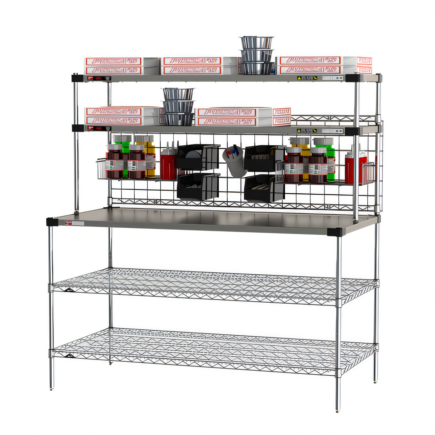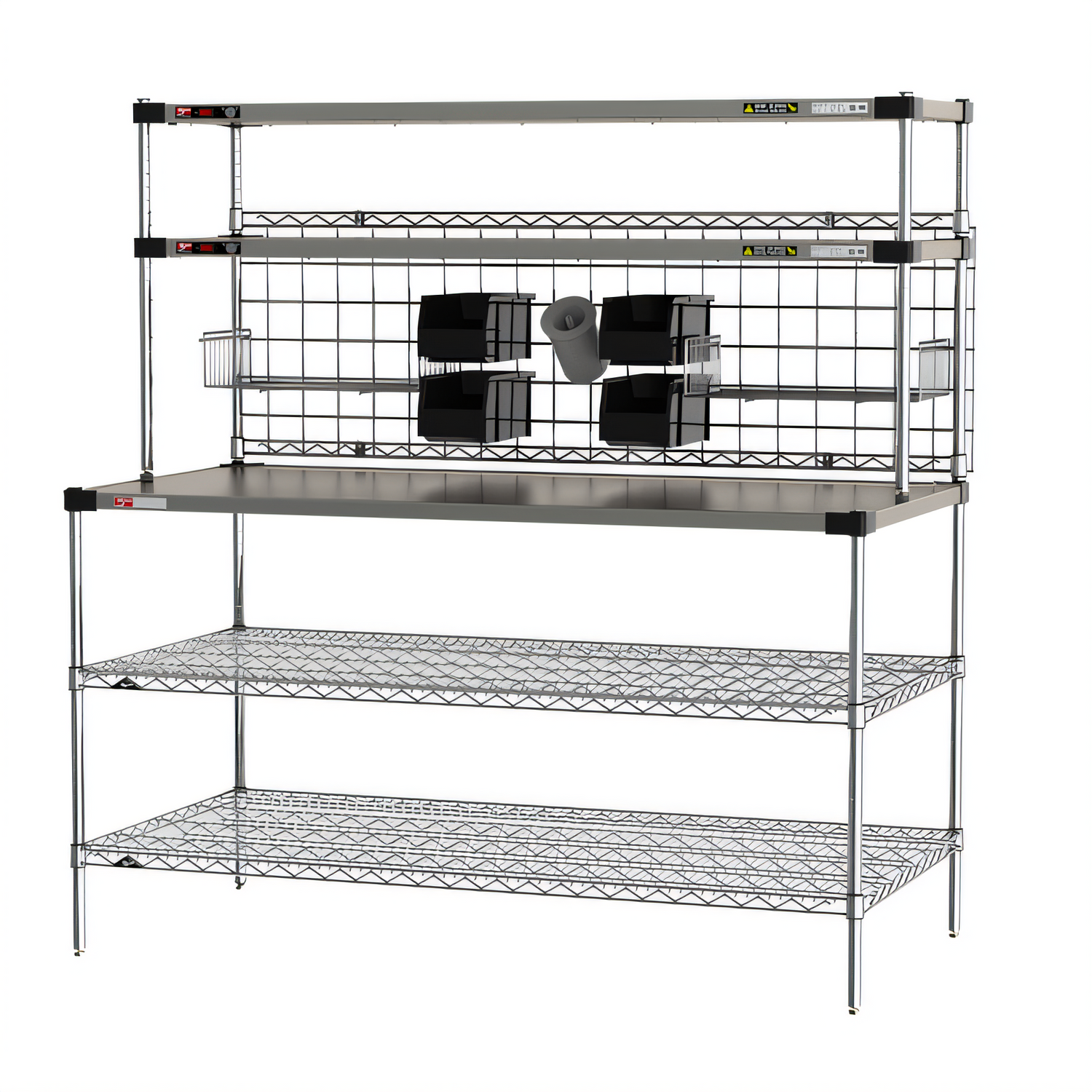 Prep Workstation with Overhead Heated Shelves, (1) 60"W x 30"D reinforced stainless steel shelf, (2) 60"W x 30"D SuperErecta® wire shelves, (2) 60"W x 18"D Super Erecta® Hot Heated Shelves, adjustable thermostat to 200°F max temperature, 304 stainless steel construction, includes: (4) split sleeves, (4) 3" polymer feet for countertop use, 120v/60/1-ph, 400 watts, 3.4 amps, cord & NEMA 5-15P, NSF, cULus, Made in USA