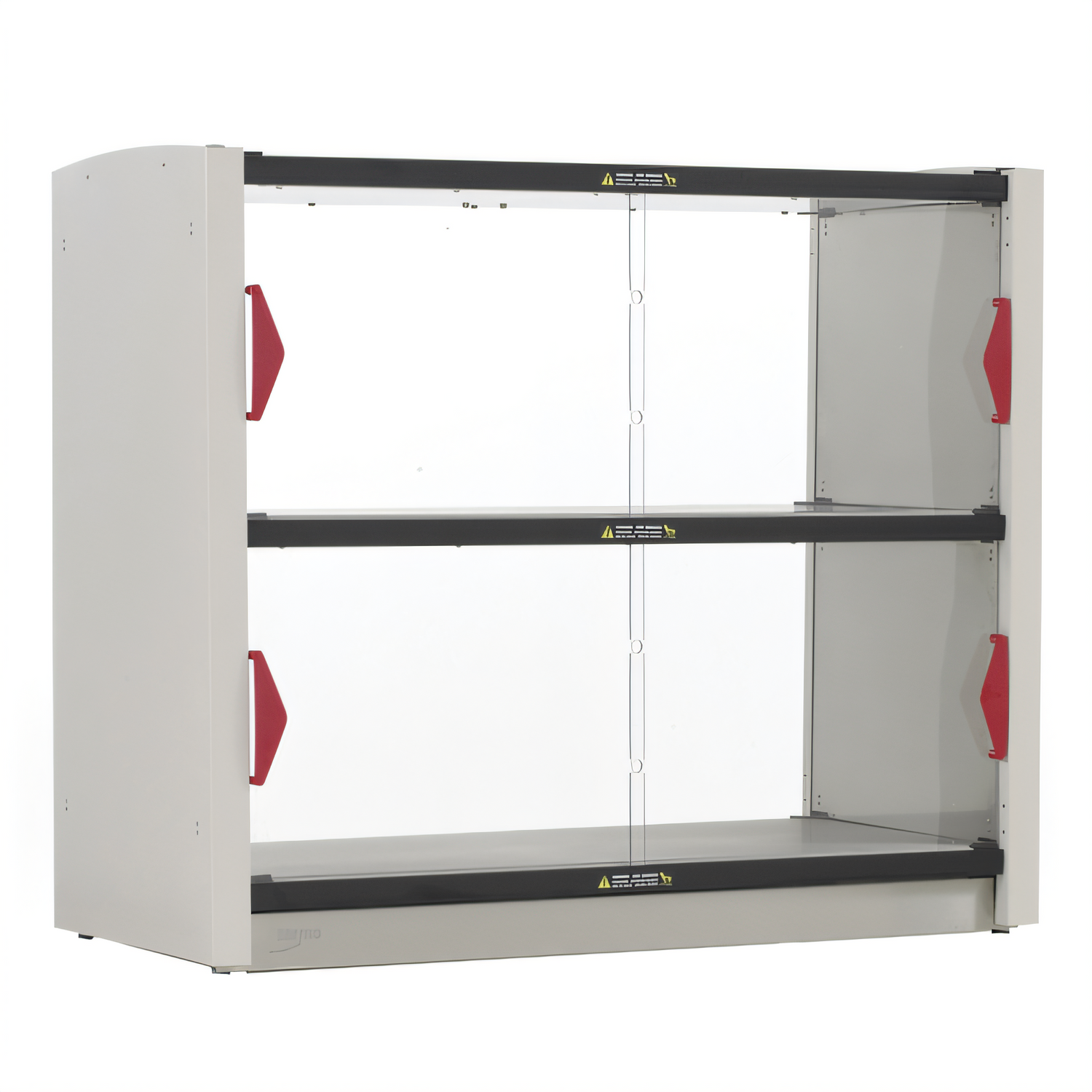 Metro2Go Grab & Go Hot Station, (2) individually controlled stainless steel shelves with sliding front polycarbonate doors, pass-thru, open back, powdercoated side panels, adjustable thermostat to 200°F max temperature, 120v/60/1-ph, 800 watts, 6.7 amps, cord & NEMA 5-15P, NSF, cULus, Made in USA