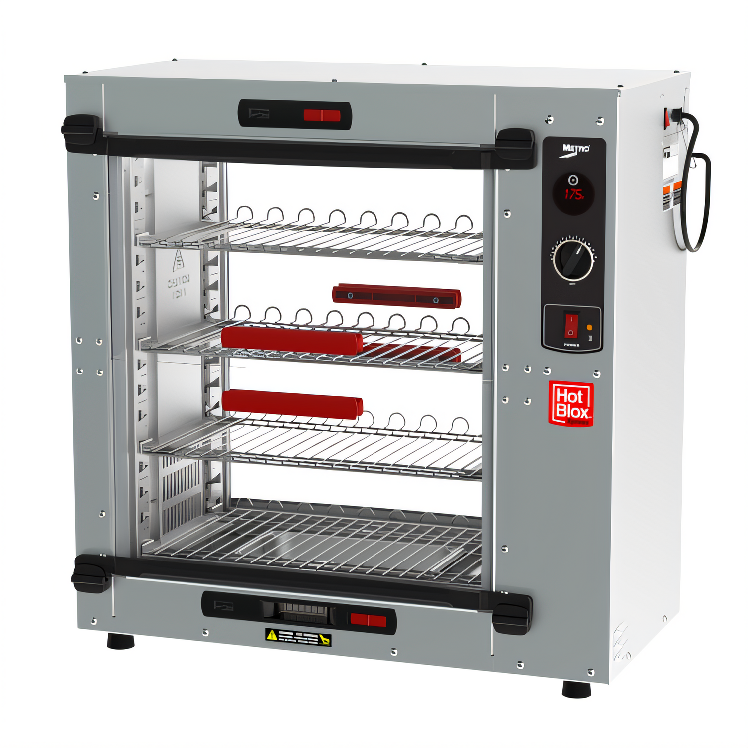 Metro HotBlox Xpress S8 countertop heated cabinet: quick-access insulated holding with LED lighting, 4 shelves, 875W, UL/NSF certified.