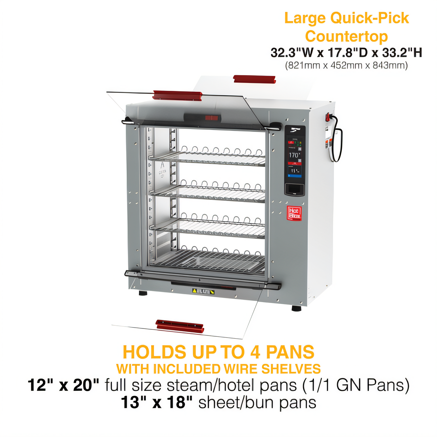 HotBlox Xpress S8 Quick Access Pass-Thru Holding Cabinet, countertop, insulated, (4) shelves, clear flip doors, Touchscreen controls, LED lighting, accommodates: half size sheet pans, full & fractional steam pans, or packaged food Items, Aluminum construction, 875W, 120v/60/1-ph, cord with NEMA 5-15P, UL, NSF