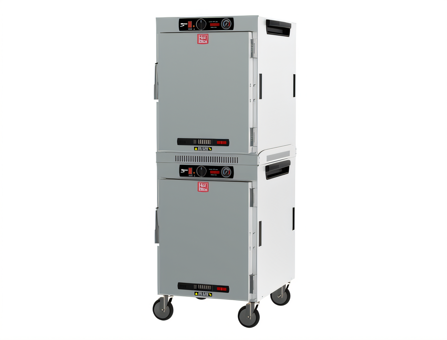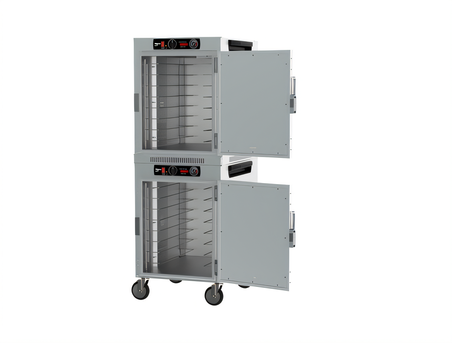 HotBlox™ Insulated Holding Cabinet, wide (16) pan, stacked - dual cavity mobile, analog controls, solid door, holds full or half size steam and sheet pans, 5" casters, (2) 875 watts, (2) 120/60/1-ph, (2) cords with NEMA 5-15P, aluminum, (includes accessories), UL, NSF, Made in USA