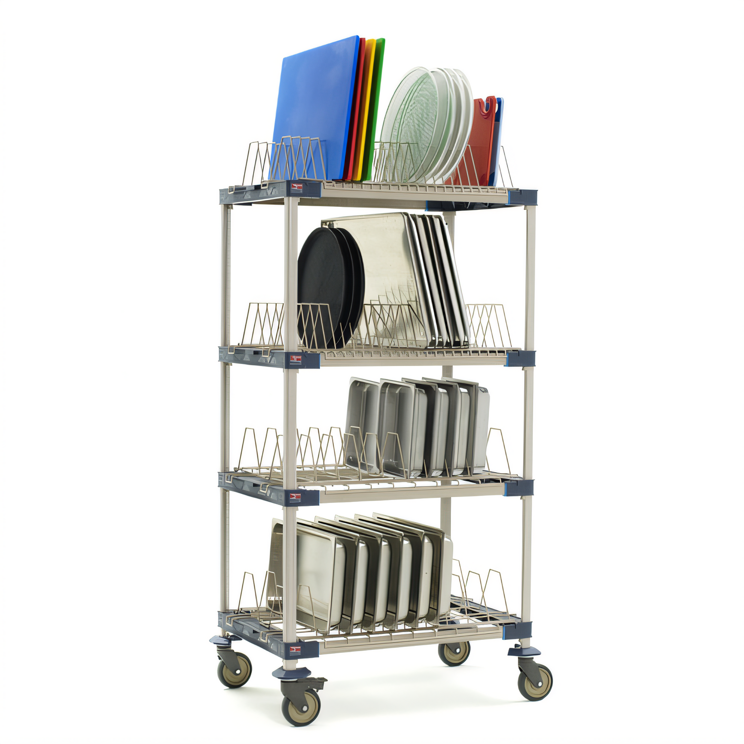 MetroMax® 4 Mobile Drying Rack Unit, 36"W x 24"D x 68"H, 4-tier, for trays/cutting boards/sheet pans & steam pans, includes: (4) open shelf frames, (4) 63" mobile posts, (2) cutting board/tray drying racks, (2) pan racks, (4) polymer swivel casters (2 with brakes), built in Microban® antimicrobial product protection, NSF