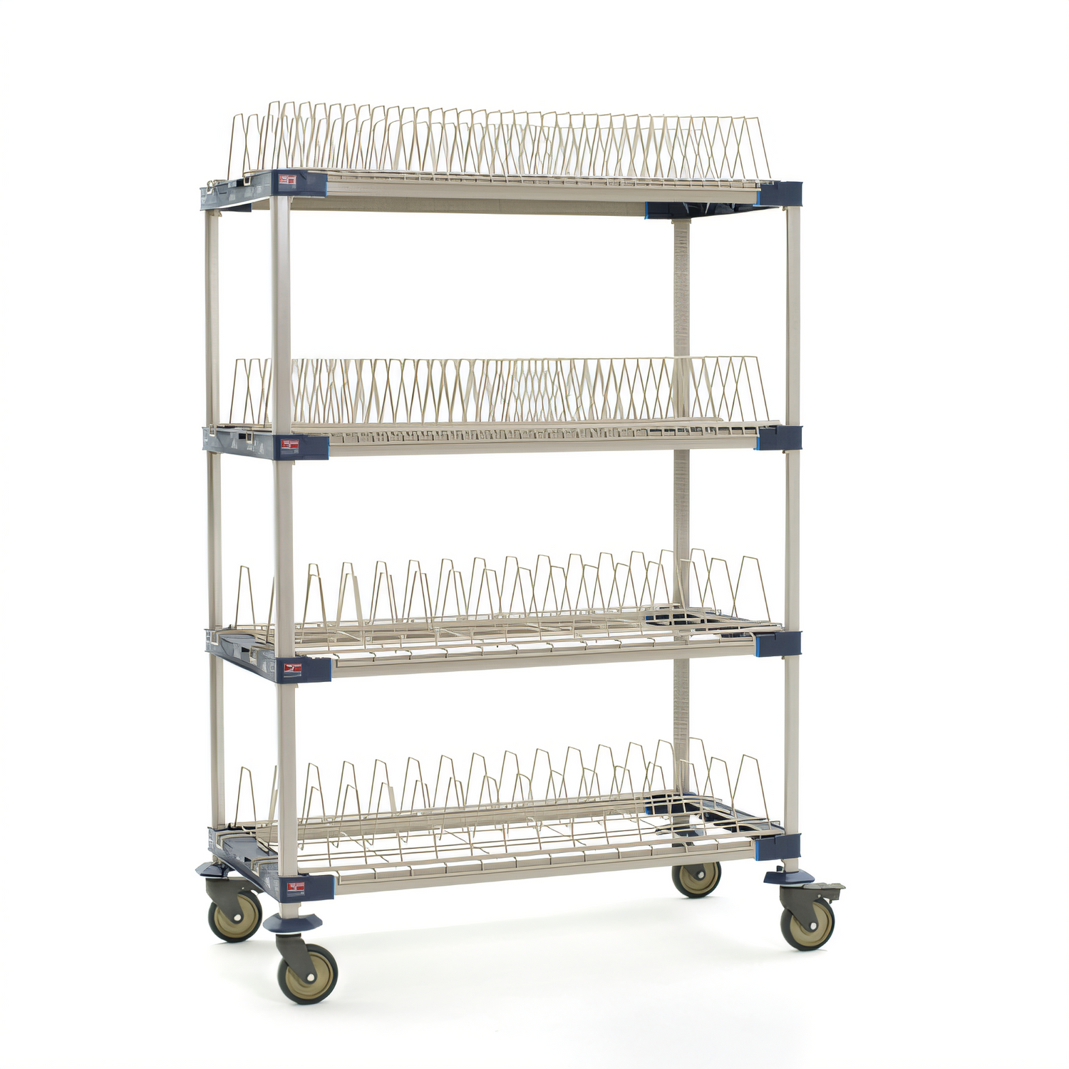 MetroMax® 4 Mobile Drying Rack Unit, 48"W x 24"D x 68"H, 4-tier, for bulk drying & trays/cutting boards/sheet pans, includes: (3) open shelf frames, (1) shelf, (4) 63" mobile posts, (2) drop-ins, (1) cutting board/tray drying rack, (4) polymer swivel casters (2 with brakes), built in Microban® antimicrobial product protection, NSF