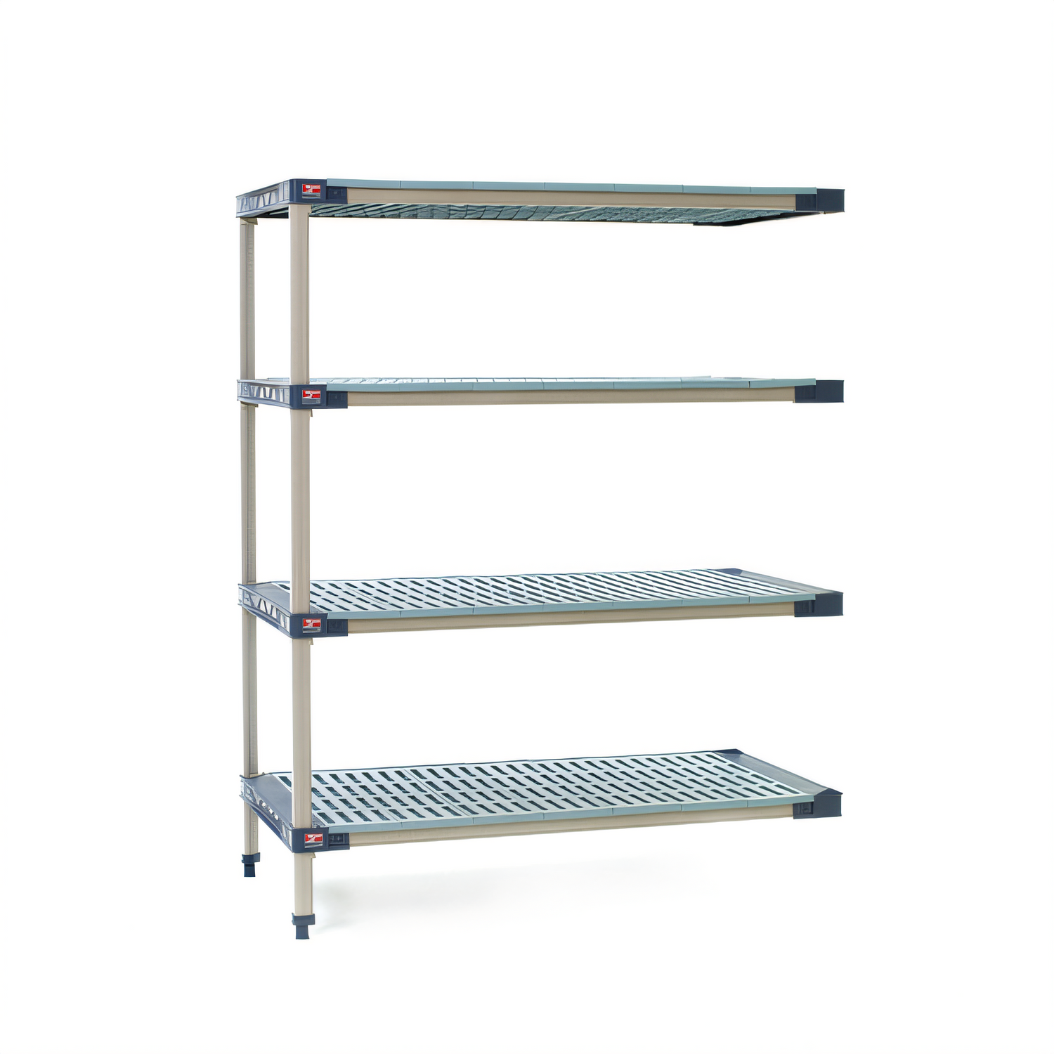 MetroMax® 4 Add-On Shelving Unit, 24"W x 18"D x 74"H, rust proof, 800 lb capacity per shelf, 2000 lb. capacity per unit, includes: (4) open grid polymer shelves with removable shelf mats, bag of (4) wedge connectors for each shelf, (2) polymer posts & (8) "S" hooks for an end-to-end configuration, Microban antimicrobial product protection, KD, NSF