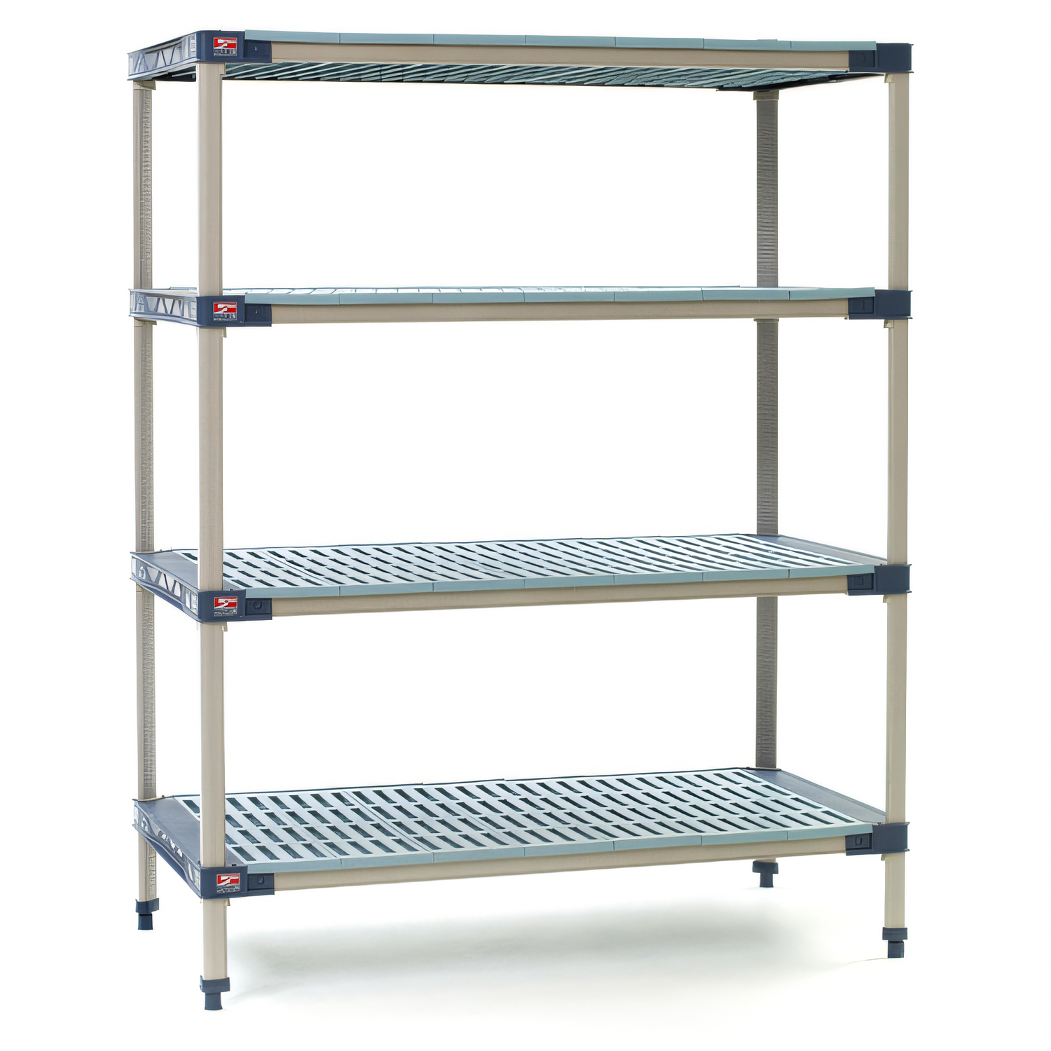MetroMax® 4 Starter Shelving Unit, 30"W x 21"D x 74"H, rust proof, 800 lb. capacity per shelf, 2000 lb. capacity per unit, (4) open grid all-polymer shelves with removable shelf mats, bag of (4) wedge connectors for each shelf, (4) polymer posts, Microban antimicrobial product protection, KD, NSF