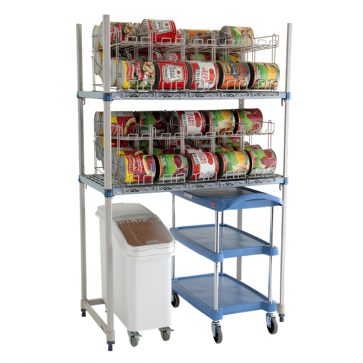 Max Q Can Rack Configuration 24"D x 48"W x 74"H, corrosion resistant, (2) Max Q Shelves, (10) epoxy coated wire can rack accessories, (4) polymer posts, & 3-sided frame for roll under storage capability, accommodates up to (80) #10 cans or (120) #5 cans, NSF