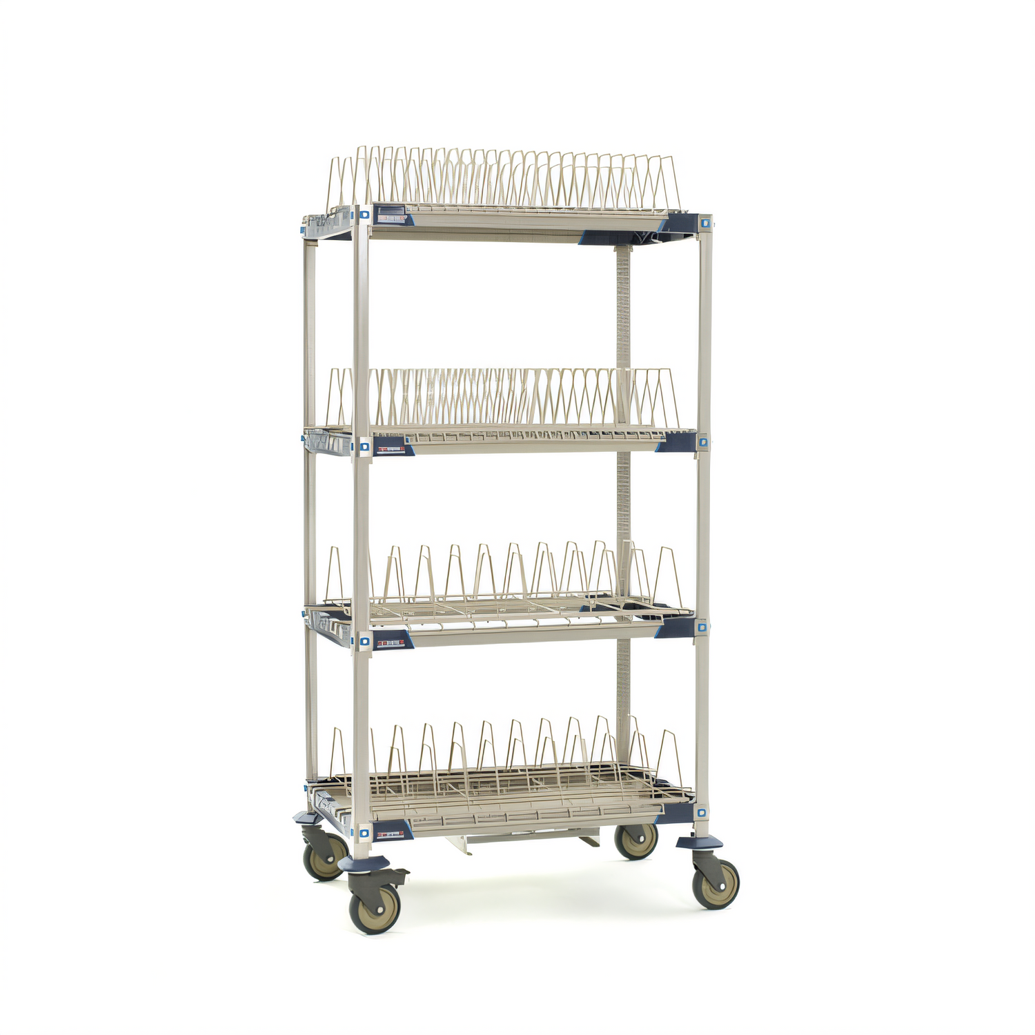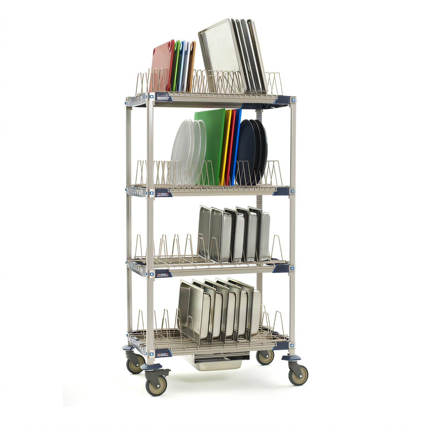 MetroMax® i Mobile Drying Rack Unit with Drip Tray, 36"W x 24"D x 68"H, 4-tier, for trays/cutting boards/sheet Pans & steam pans, includes: (4) open shelf frames, (4) 63" mobile posts, (2) cutting board/tray drying racks, (2) pan racks, (1) adjustable drip tray, (4) polymer swivel casters (2 with brakes), built in Microban® antimicrobial product protection, NSF