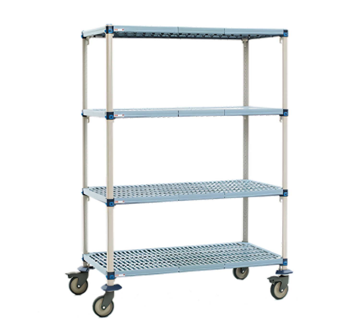 MetroMax® Q Mobile Shelving Unit, 36"W x 18"D x 67-5/16"H, (4) open grid shelves with eopxy coated steel frames & removable polymer shelf mats, (4) polymer posts, Microban antimicrobial product protection, (4) swivel 5" casters with polyurethane treads (2 braked), Microban antimicrobial product protection, KD, NSF
