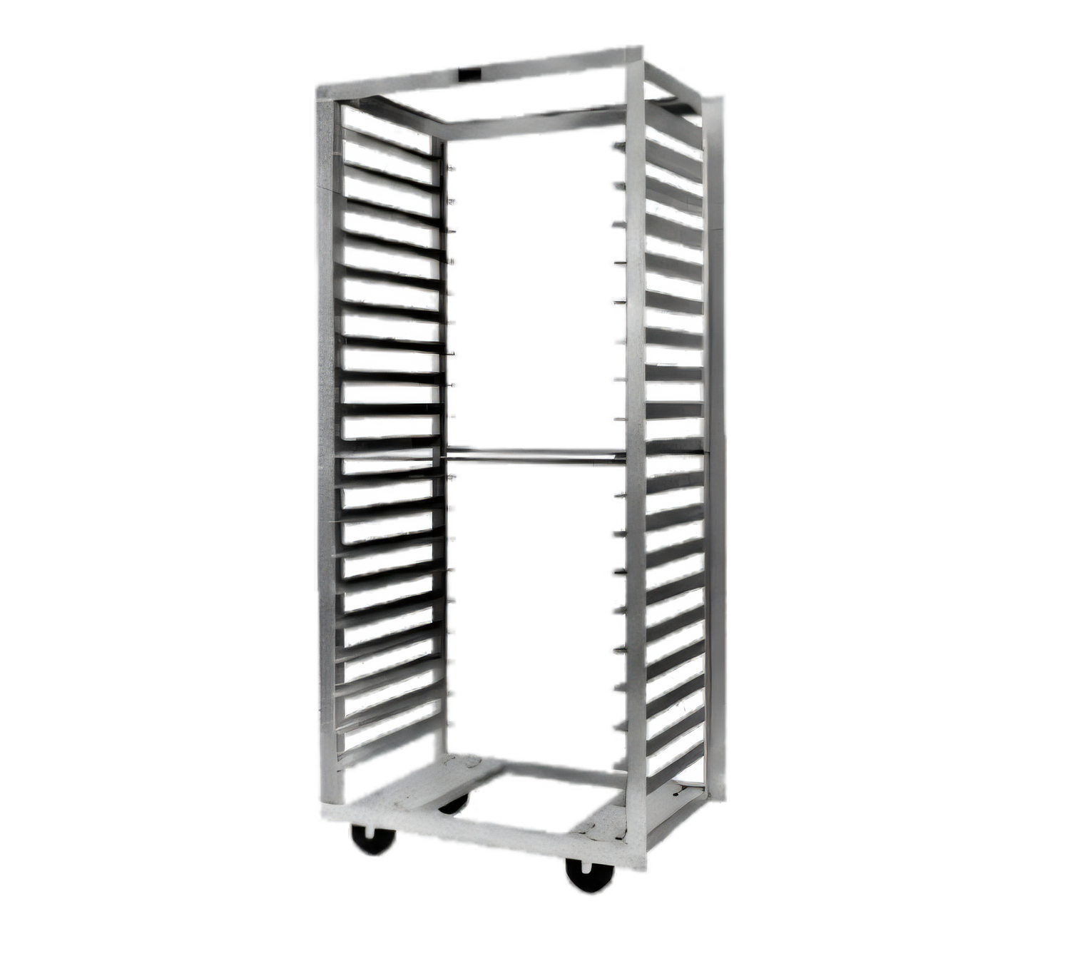Pan Rack, mobile, side loading, 29-3/8"W x 69-1/4"H, 18-5/8"D, open sides, with slides for (20) 18" x 26" pans, slides on 3" centers, riveted angle-type aluminum frame, with 5" swivel casters (2 with brakes), NSF