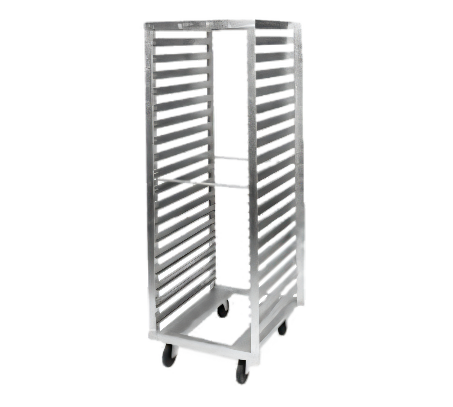 Roll-In Refrigerator Rack, pass-thru, 21-1/4"W x 64"H, 26"D, open frame design, slides on 1-1/2" centers, holds (36) 18" x 26" pans, sized to fit refrigerator, riveted extruded aluminum frame construction, gray continuous bumper, 5" swivel casters (2) with brakes, NSF