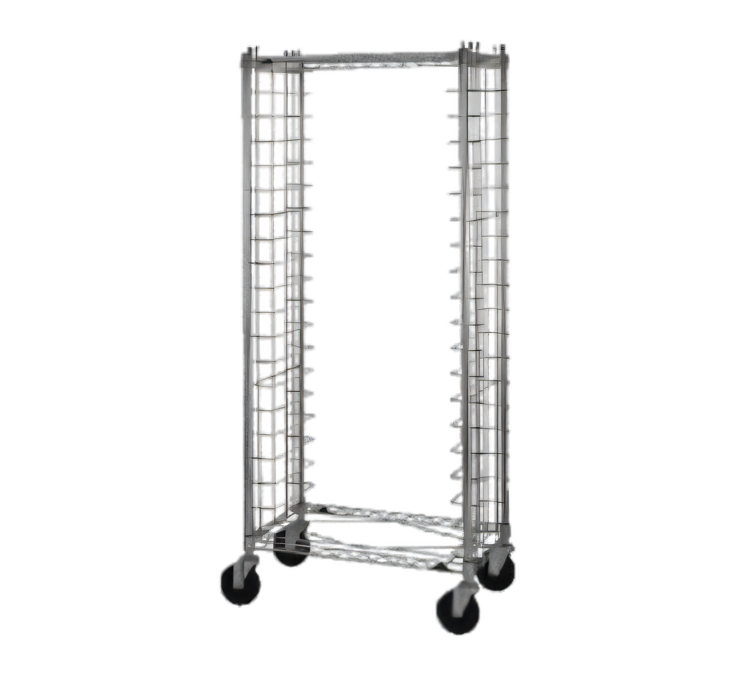 Wire Bun Pan Rack, mobile, side load, 19-1/2" x 30"L x 69"H, (20) 18" x 26" pan capacity, slides on 3" centers, UPS shippable, no tool assembly, 5" swivel casters, Brite (zinc) finish, NSF