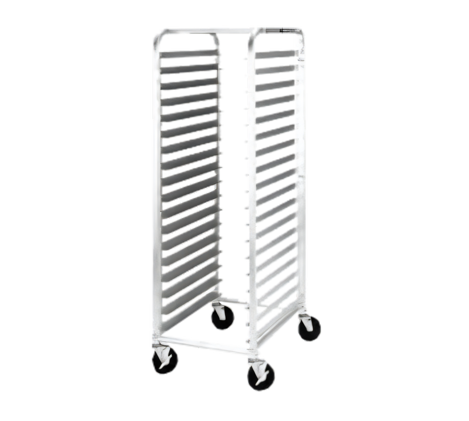 Pan Rack, mobile, end load, single section, 20-3/8"W x 64-1/8"H, 28"D, open sides, with slides for (34) 18" x 26" pans, slides on 1-1/2" centers, riveted tubular aluminum frame, 5" swivel casters (2) with brake, KD, NSF