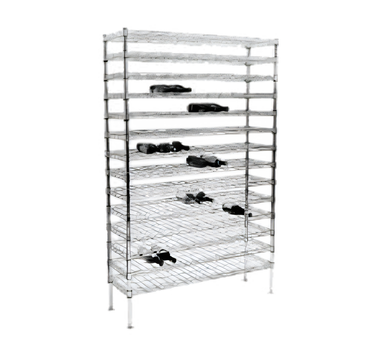 Super Erecta® Cradle Wine Shelving, wire, 36"W x 14"D x 86-3/4"H, (153) bottle capacity (750ml bottles), includes: (17) shelves, (4) post with triangular foot plates, (2) wall clamps, chrome plated finish, NSF