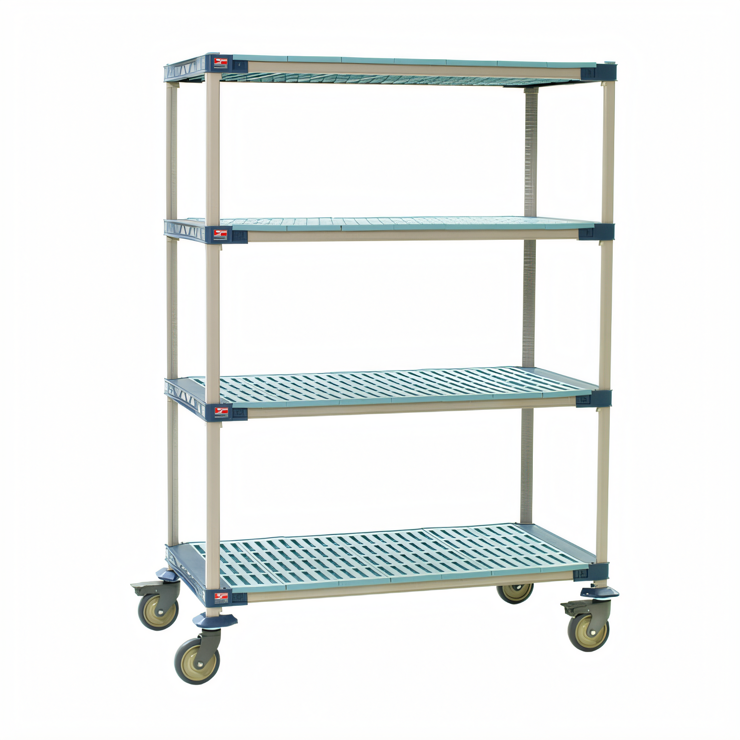 MetroMax® 4 Mobile Shelving Unit, four tier, 48"W x 24"D x 68"H, (4) open grid polymer shelves with removable shelf mats, unit load capacity of 750 lbs., (4) polymer MX63UP posts, wedge connectors, (4) polymer casters (2 swivel & 2 braked), built in antimicrobial product protection, NSF