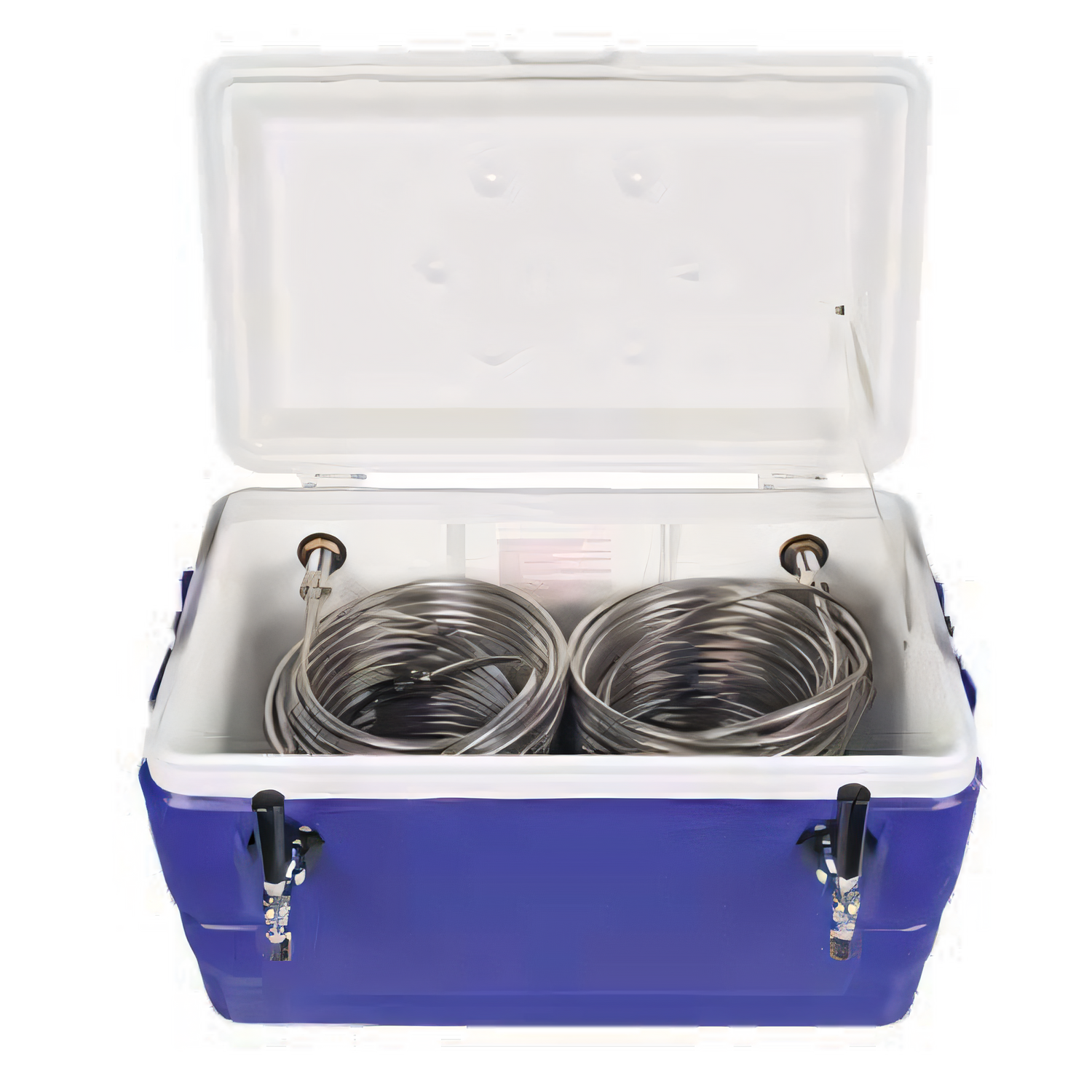 Coil Cooler, 48 quart, 100/20 ft coil length, 3/8" with 1/4" choke, (2) faucets, shanks, ice box coupler assemblies, heavy duty side handles, 95° hold open lid with snap-lock child safety latch, recessed drain plug, blue exterior