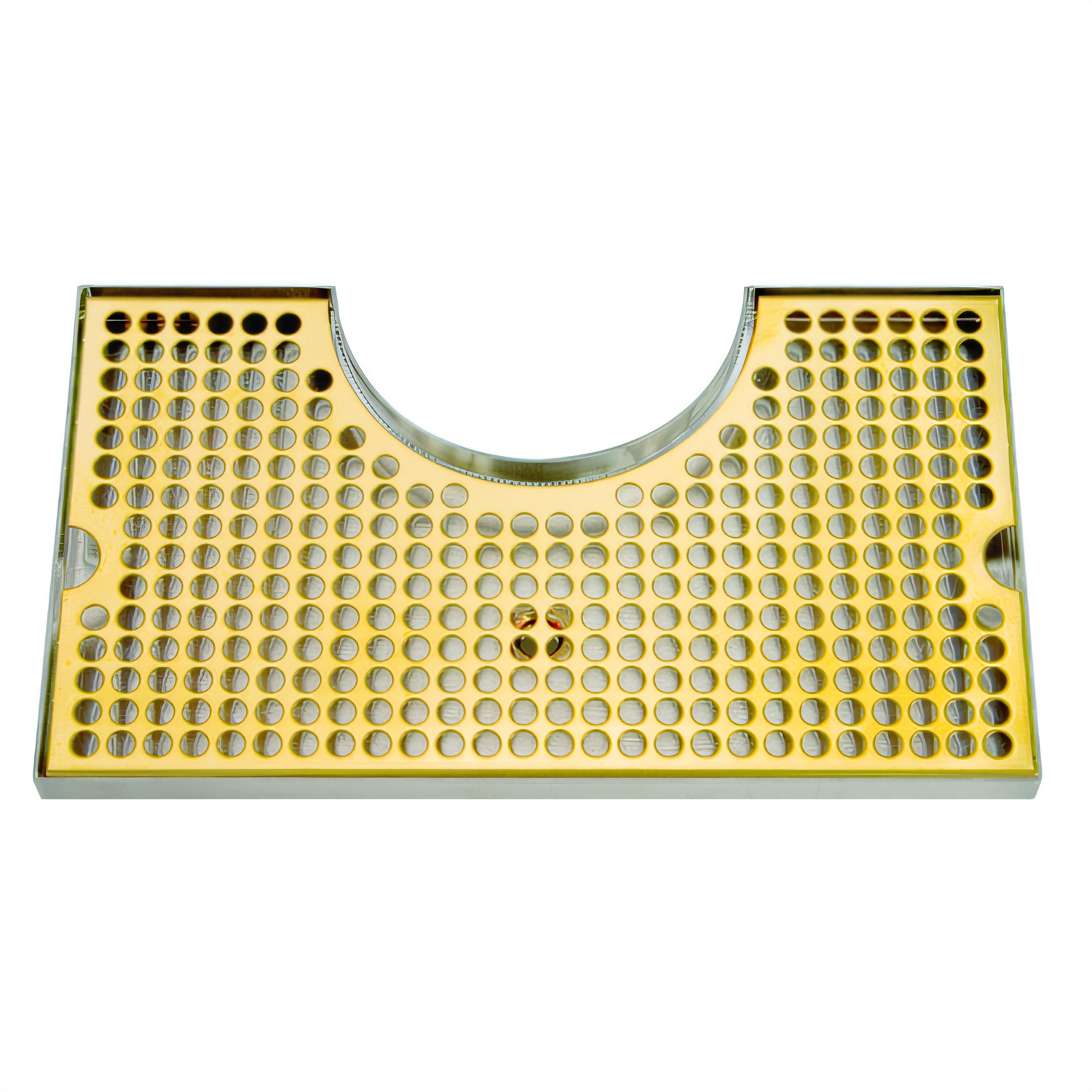 Drip Tray Trough, surface mount, 14"W x 8"D, cutout for 4" diameter draft beer column, perforated PVD brass screen, 5/8" O.D. drain, stainless steel construction