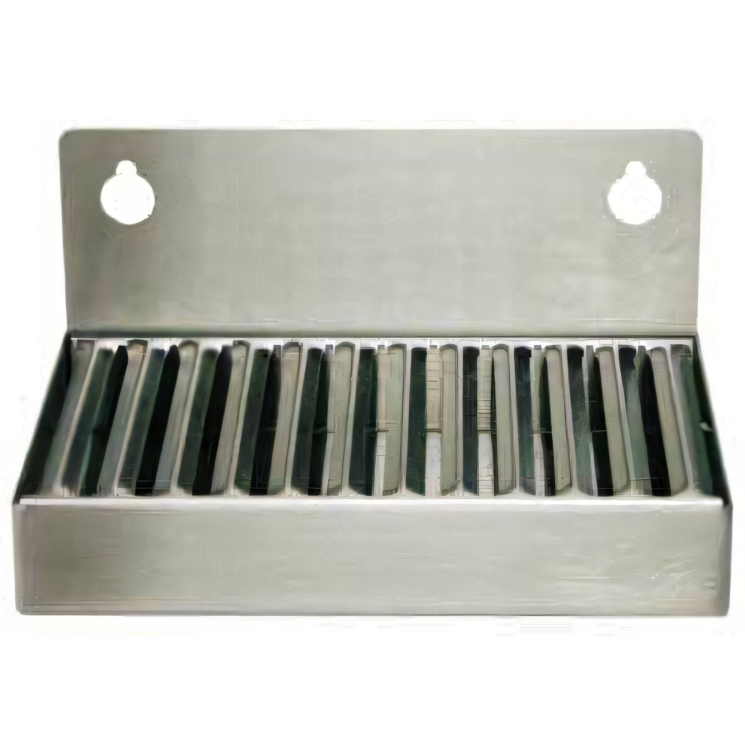 Refrigerator Drip Tray Trough, wall mount with keyholes, 6"W x 4"D x 3"H, louvered stainless steel screen, no drain, stainless steel construction