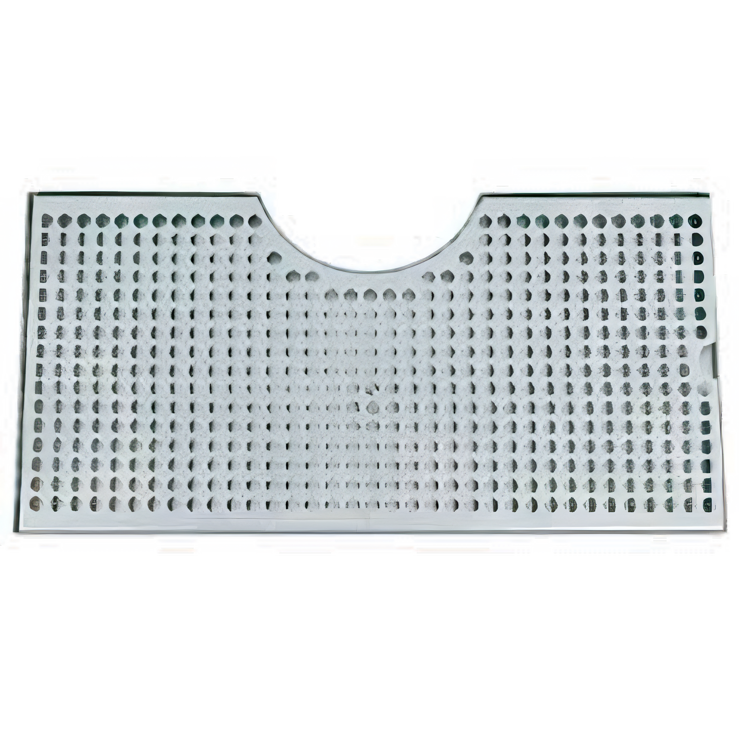 Drip Tray Trough, surface mount, 18"W x 9"D, perforated stainless steel screen, 6-1/4" diameter x 4"D cutout for column tower, 1/2" drain, stainless steel construction