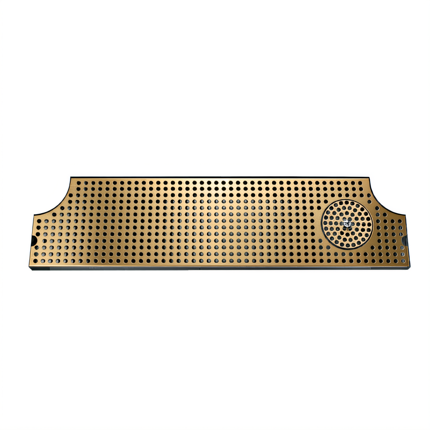 Drip Tray Trough, surface mount, 28"W x 8-1/2"D, integral glass rinser (NSF-certified), perforated PVD brass screen, 5/8" O.D. drain, includes cutouts for Metropolis "H" draft tower, stainless steel construction