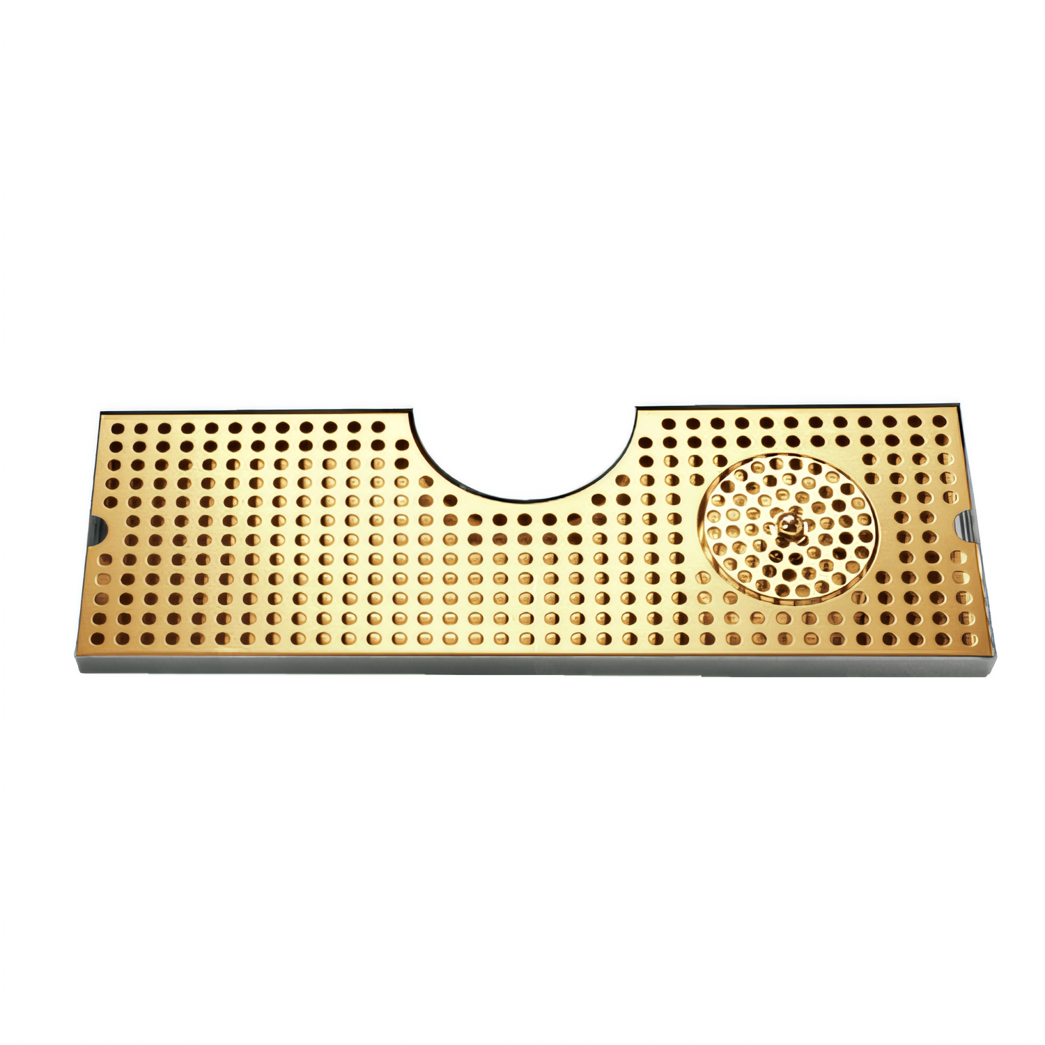 Drip Tray Trough, surface mount, 24"W x 8-1/2"D, integral glass rinser (NSF-certified), perforated PVD brass screen, 5/8" O.D. drain, includes cutout for Metropolis "T" draft tower, stainless steel construction