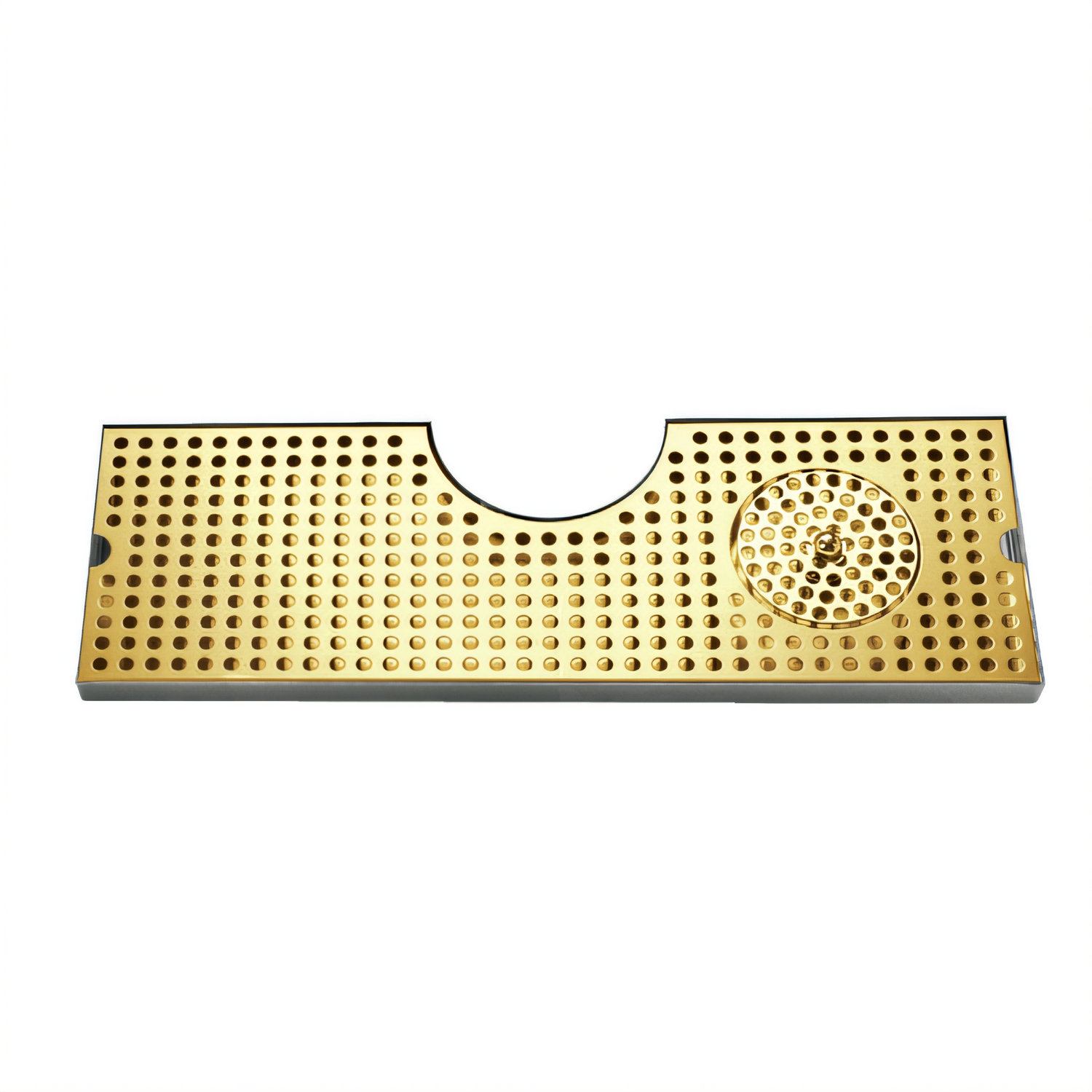 Drip Tray Trough, surface mount, 34"W x 8-1/2"D, integral glass rinser (NSF-certified), perforated PVD brass screen, 5/8" O.D. drain, includes cutout for Metropolis "T" draft tower, stainless steel construction