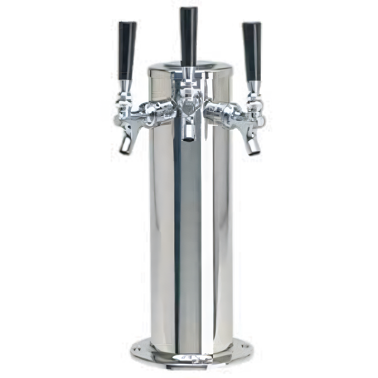 Column Draft Beer Tower, countertop, 4" dia. x 13-3/4"H, air-cooled, (3) chrome-plated brass faucets (handles not included), 10-3/8" faucet clearance (11-1/8" center faucet), 6" dia. base, chrome-plated bonnet & collar, mounting gaskets & hardware provided, polished stainless steel finish