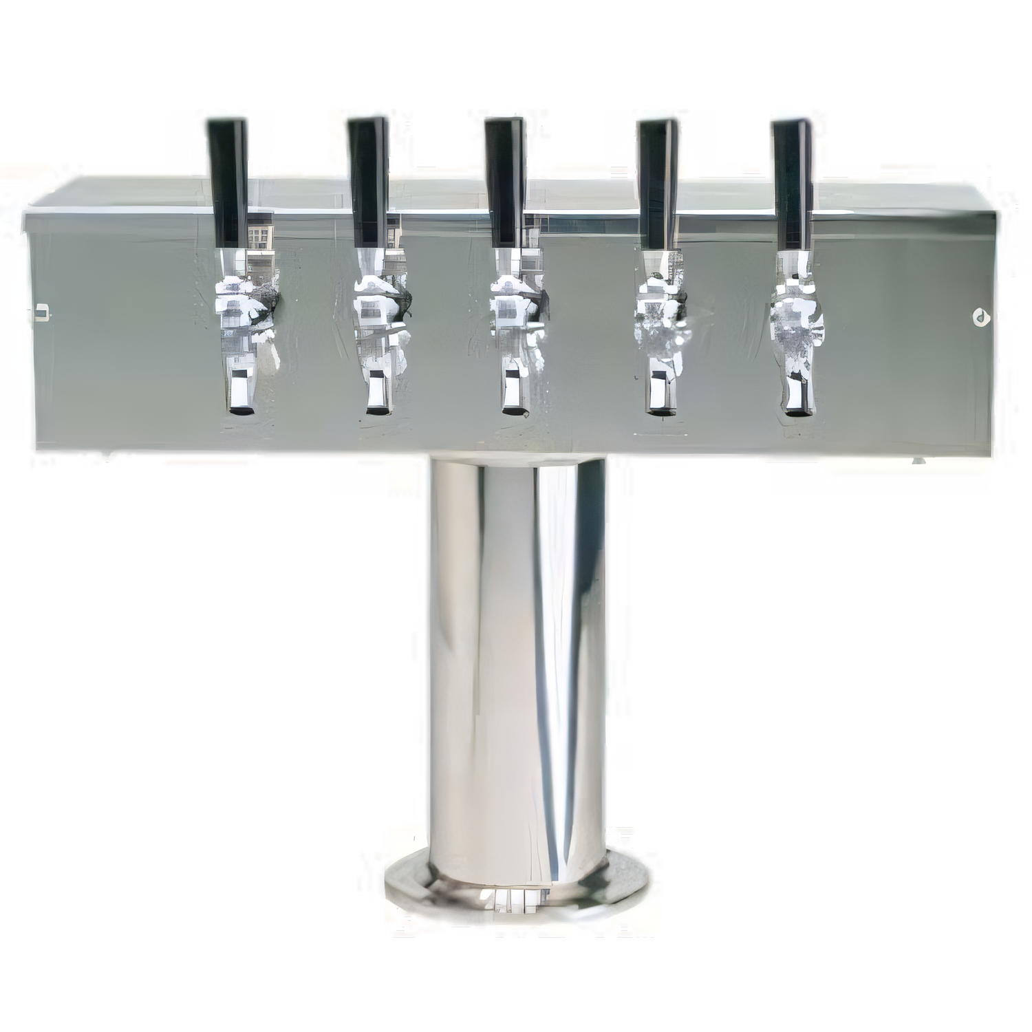 T Style Draft Beer Tower, countertop, 20"W x 15-1/2"H, air-cooled, (5) chrome-plated brass faucets (handles not included), 3" OC, 11-1/4" faucet clearance, 11-5/8" faucet clearance, 4" dia. column with 6" dia. base, mounting gaskets & hardware provided, polished stainless steel finish
