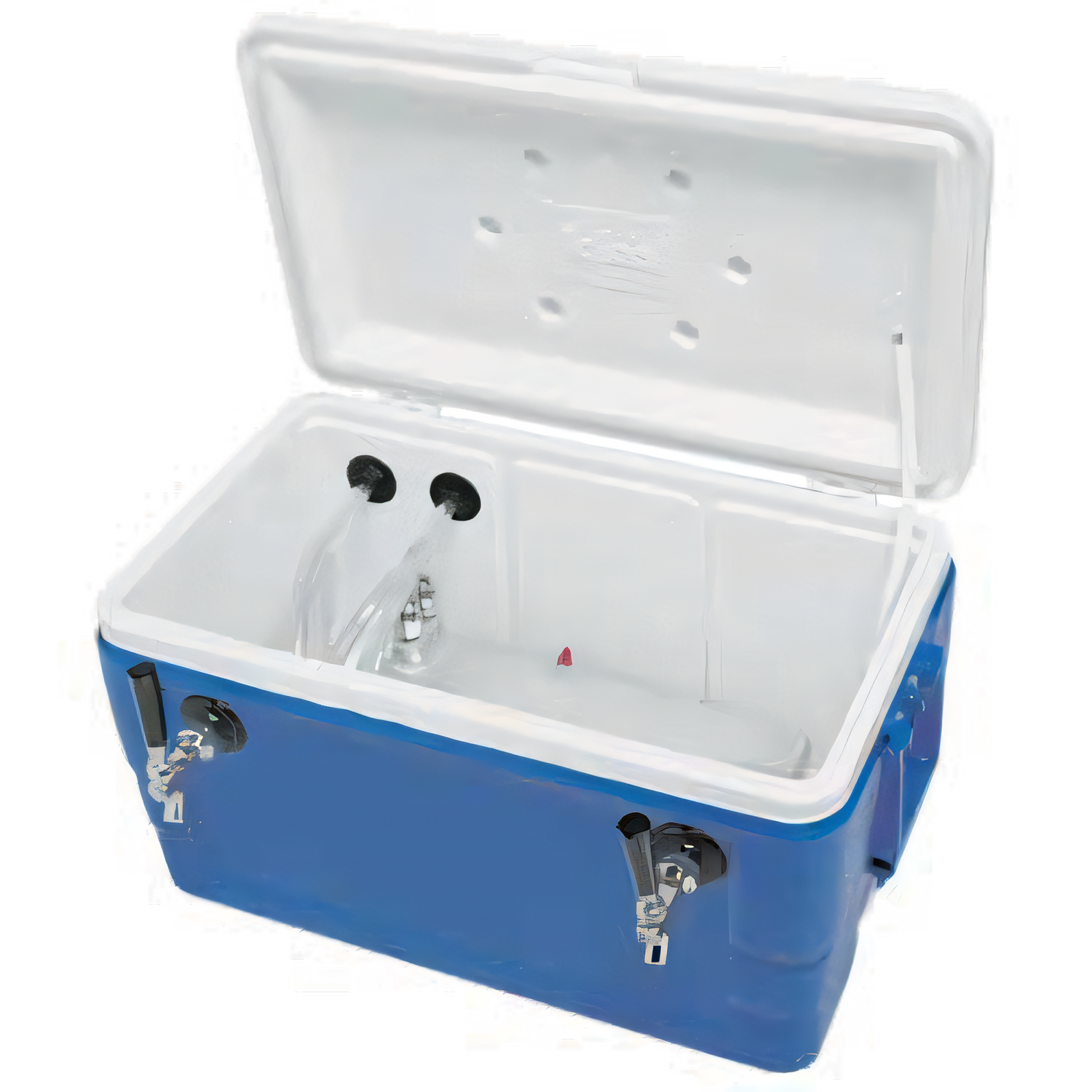 Cold Plate Cooler, 48 quart, (2) faucets, 10" x 15" cold plate & racks, jumper lines, faucets, shanks, & beer line assemblies, recessed drain plug, blue exterior