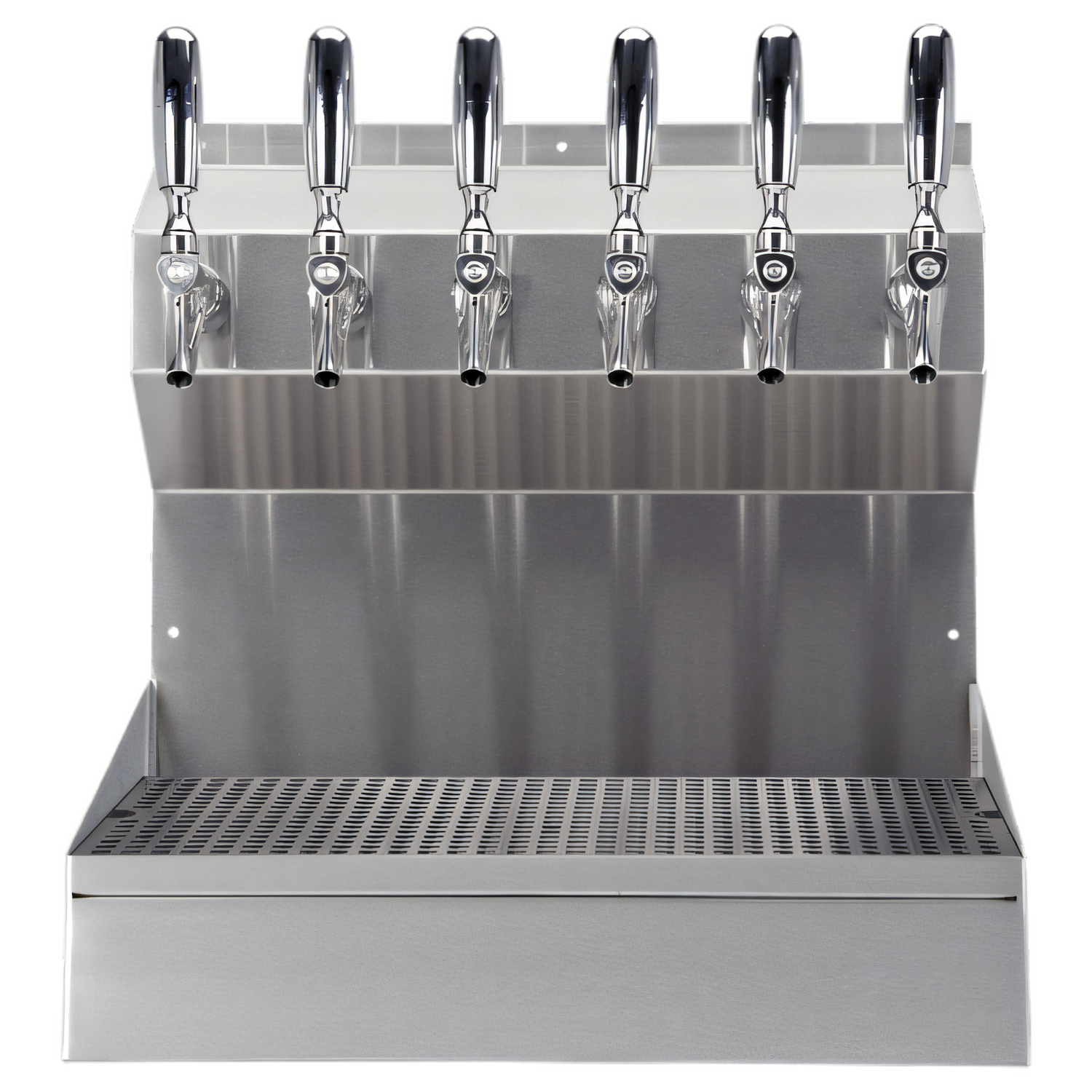 - Six polished stainless steel faucets on 3" centers with 13" clearance—ideal for pint glasses, pitchers and growlers.