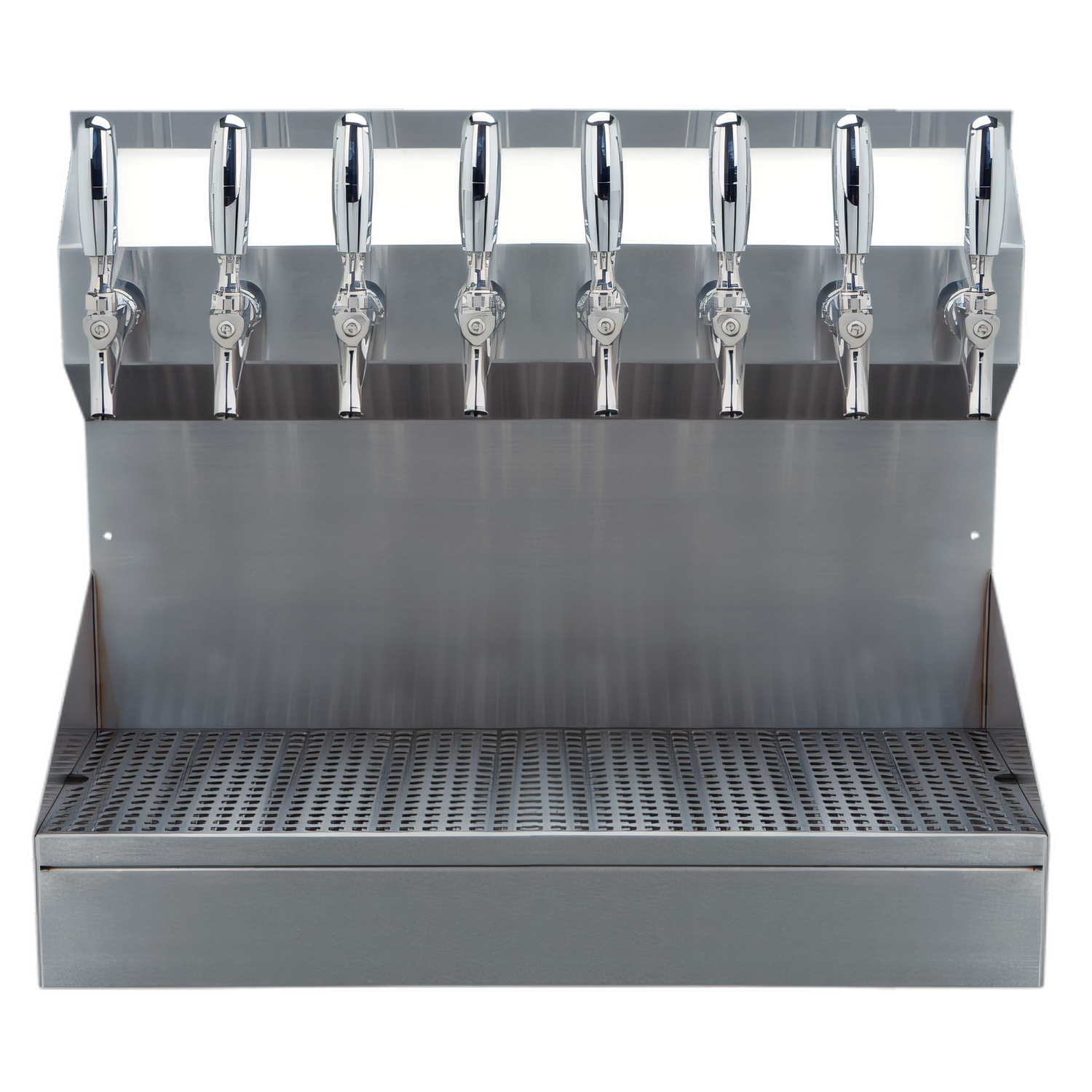 - Eight polished stainless steel faucets, 3 in O.C. spacing and 13 in faucet clearance—ideal for taller growlers and steins.
