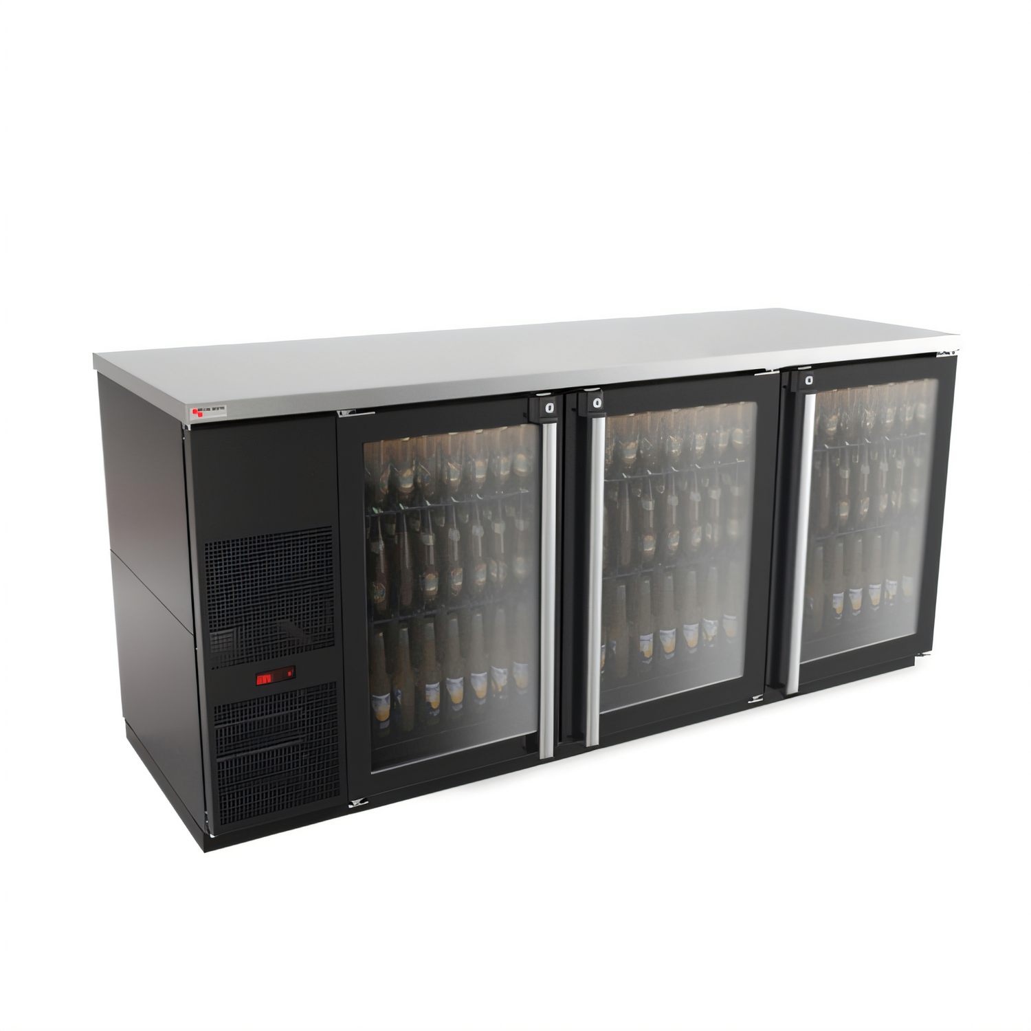 Model MBB78G-E – 3 Glass Doors | 30.8 cu ft | 4-Keg / 1,092-Can CapacityBuilt by beer-industry experts, the Pro-Line™ E-Series back bar puts reliable, energy-smart refrigeration right where you serve. Front-breathing ventilation lets you slide this 80" powerhouse under an existing bar run, while brilliant LED lighting and three locking glass doors turn your beverage selection into a sales-driving display.