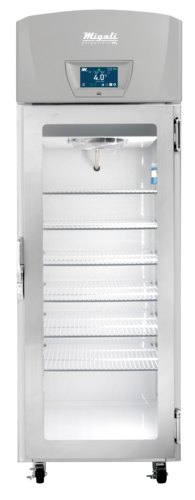 Migali EVOX-1RG-LB-RC medical refrigerator 20.2 cu ft, glass door, +2–+8°C, touch LCD, stainless exterior, ADA, Made in USA, warranties.