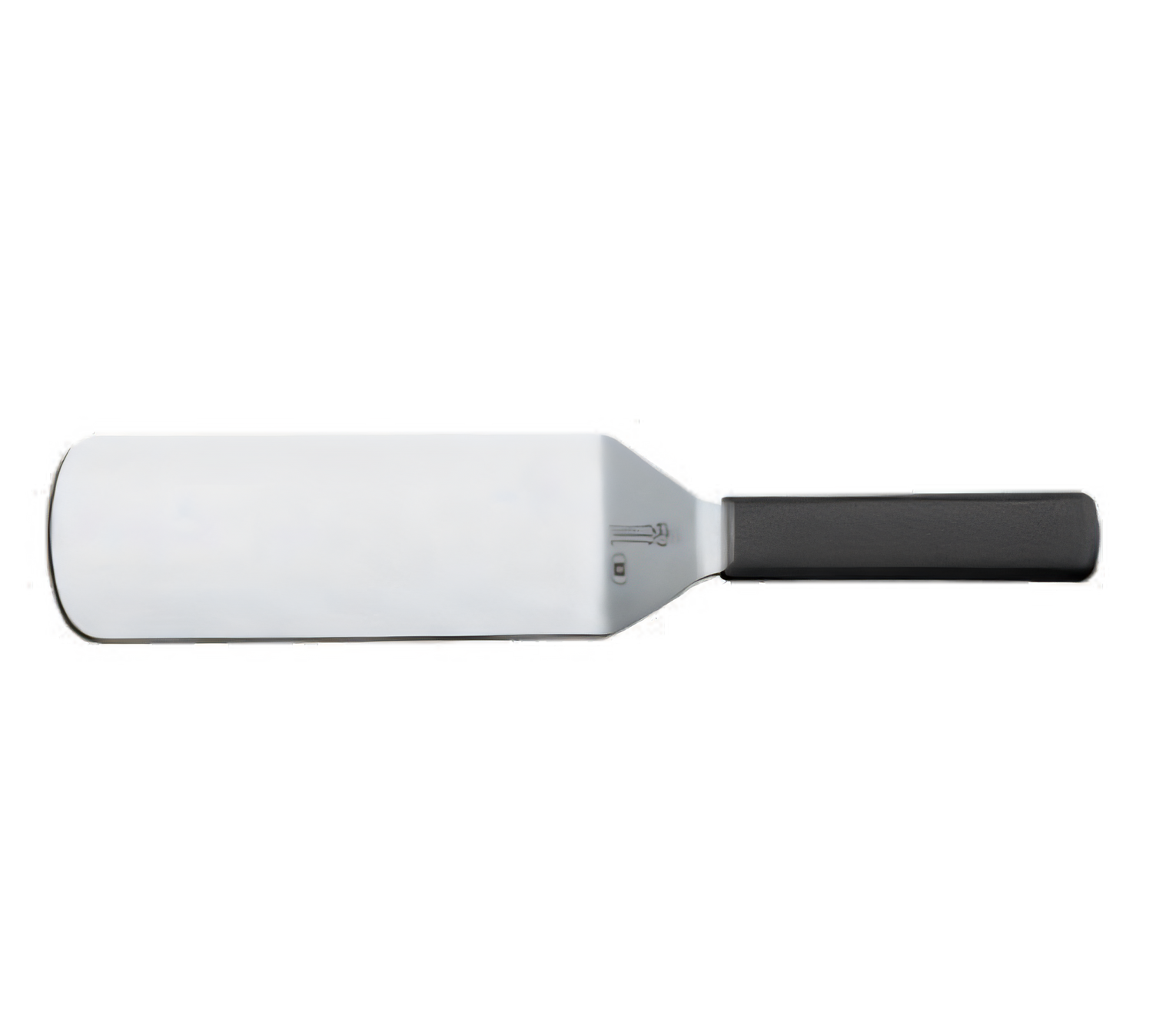 Mundial 8" heat-resistant stainless turner with antimicrobial, NSF-certified black handle—durable to 446°F for safe, reliable flipping.